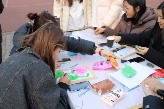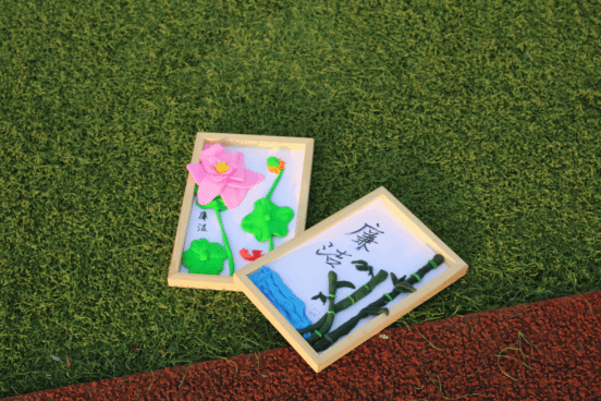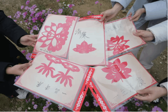 本次嘉年华精心设计了五大主题活动环节,巧妙地将廉洁理念转化为可感、可触、可参与的沉浸式体验。在足球场边,6名学生代表围绕“巧手塑廉形,匠心传廉意”主题潜心创作,白、绿、黑、粉等基础色黏土在指尖流转,莲花、劲竹、“廉”字等具象化作品成型,每一件作品都凝聚着对廉洁精神的独特诠释。同学们手持剪刀,剪出了不同视角的莲花,通过剪纸艺术转化为可感、可学的视觉符号,彩纸翻飞间,一幅幅寓意“清正奉公”的剪纸作品跃然纸上。