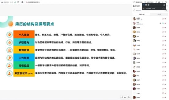 简历作为求职的“第一块敲门砖”,其创新性与针对性是本次会议的重点。朱蕊老师详细拆解了简历的核心结构,强调在涵盖个人信息、求职意向、教育背景等基础模块的同时,需以创新创业思维优化内容呈现。她强调,在实践经历描述中,需运用专业术语和量化数据凸显成果价值,同时注意打破“罗列堆砌”的传统模式,精选与应聘岗位高度相关的高等级资质,通过分类呈现、亮点标注等方式,让HR快速捕捉核心优势,实现人职精准匹配。