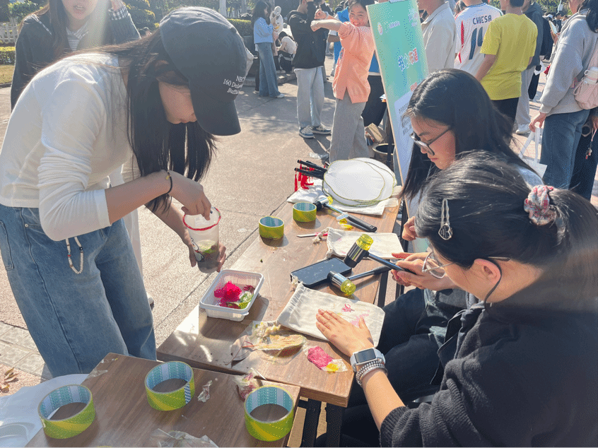 为保障活动顺利开展,艺术学院心理服务站的伙伴们,提前筹备多日,精心挑选各类天然植物叶片,准备空白帆布包、拓染工具、环保固色剂等材料,安排学生志愿者现场指导。活动中,同学们放慢脚步,挑选心仪的叶片,在志愿者的讲解下,通过排版、固定、敲拓、固色等一系列工序,将自然的纹理与色彩永久定格在帆布包上。大家抛开学业与生活的烦恼,全身心投入手工创作,在指尖与布料的触碰中舒缓情绪、释放压力,还互相分享创作思路,现场氛围轻松愉悦、暖意融融。