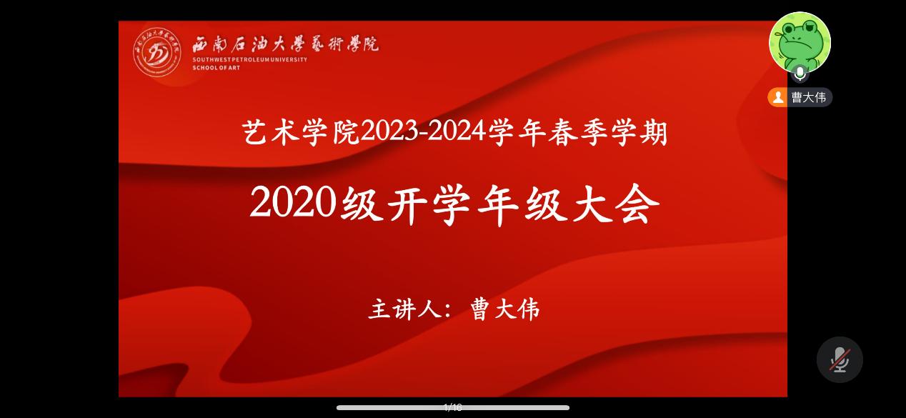 3月3日晚21点,艺术学院2020级召开2023-2024学年春季学期开学年级大会,会议由2020级辅导员曹大伟老师主持。由于毕业年级很多同学在外实习无法返校,此次会议通过腾讯会议线上进行。