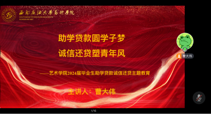 为进一步加强大学生诚信教育,完善国家助学贷款工作流程,提高学生偿还助学贷款意识、诚信意识,4月17日晚,艺术学院召开以“助学贷款圆学子梦,诚信还贷塑青年风”为主题的诚信教育大会。本次会议由2024届辅导员曹大伟老师主持。会上,曹大伟首先为大家讲解信用贷款相关规定以及还款注意事项,举例大学生不诚信还贷的实际案例,通过案例解读、政策分析等方式,引导学生重视自身信用行为,增强主动自觉还款的意识。希望同学们毕业后仍将“诚信”二次放在心头,能够按照要求,自主、自觉,按时、按量还贷,时时刻刻保持诚信为先的做人态度。