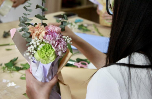 工具准备完毕,同学们进入插花环节。以花为材,修剪花枝,整理花朵,包装花篮。修剪、整枝、拼插、包装,修剪花枝、花叶,精准把握尺寸,同学们从手忙脚乱逐渐得心应手。