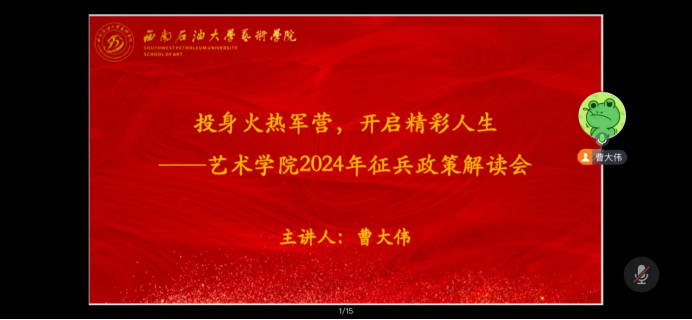 为深入贯彻落实习近平强军思想,进一步落实国家相关征兵工作要求,帮助大学生特别是毕业生全面了解征兵政策,激发应征入伍热情,3月28日上午,艺术学院通过线上针对2024届应届毕业生举行了2024年征兵政策解读会,邀请退役复学学生分享军营生活。本次解读会由2020级辅导员曹大伟老师主持。