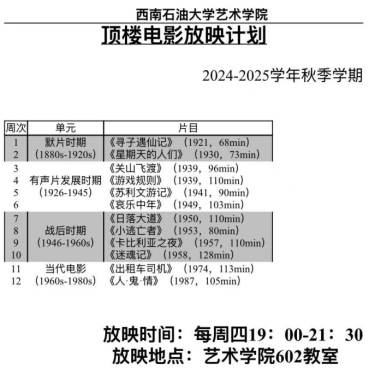 10月10日晚,由艺术学院团委、艺术学院研究生会共同主办活动“顶楼电影放映计划”在艺术大楼602教室正式拉开帷幕。顶楼电影放映计划”旨在深入挖掘经典时期电影的独特魅力与艺术价值,通过放映一系列具有代表性的经典影片,并邀请院内教师进行拉片分析,为本院学子提供一个深度学习与交流的平台。该活动计划共开展12周次,分为四个单元:默片时期(1880s-1920s)、有声片发展时期(1926-1945)、战后时期(1946-1960s)、当代电影(1960s-1980s)来展映12部影片。专业教师徐萌、张一骢两位老师出席活动。