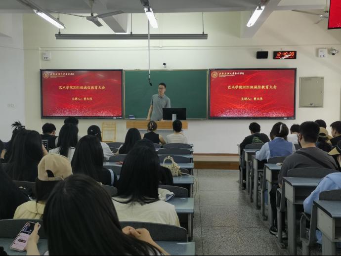 为加强同学们诚信考试观念,以饱满的精神状态迎接即将到来的各项考试,5月30日下午,艺术学院2021级诚信教育主题年级大会在博学楼举行,会议由艺术学院2021级辅导员曹大伟老师主持主持,艺术学院2021级全体学生参会。