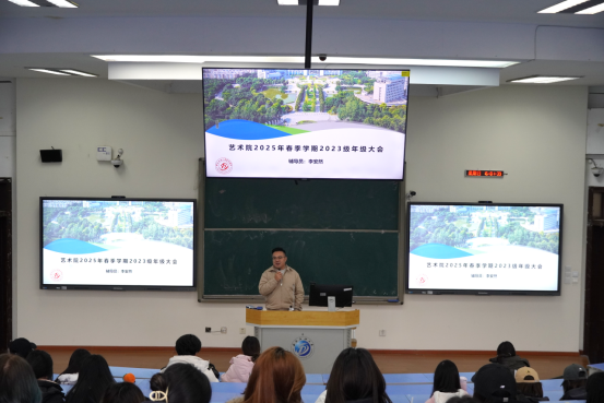 2月23日下午4点,艺术学院在思学楼B210召开了2025年春季学期2023级本科生年级大会。此次大会旨在总结过去、规划未来,进一步加强学生管理,促进学生全面发展。会议由院团委副书记、2023级本科生辅导员李安然主持,全体2023级本科生参加了此次大会。