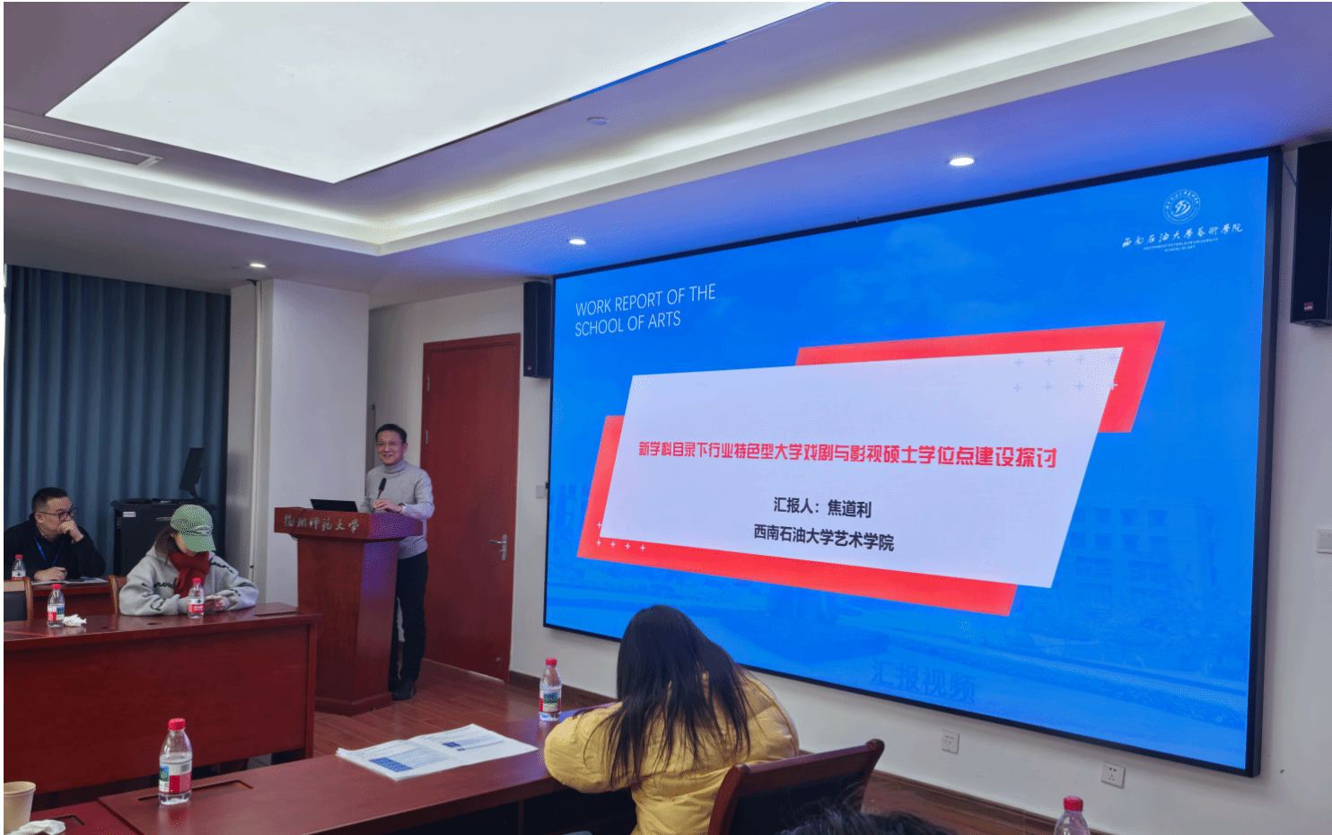 在主题发言环节,院长焦道利以“新学科目录下行业特色型大学戏剧与影视硕士学位点建设探讨”为题进行主题发言。焦道利结合我校办学定位与学科优势,深入分析了在新版学科专业目录调整背景下,行业特色型大学戏剧与影视专业学位点建设所面临的机遇与挑战。报告从明确特色化培养目标、优化课程体系与实践教学环节、建设“双师型”导师队伍、完善与行业标准衔接的质量评价体系等方面,分享了我院在戏剧与影视专业硕士培养中的思考、探索与实践经验,受到现场专家的肯定。