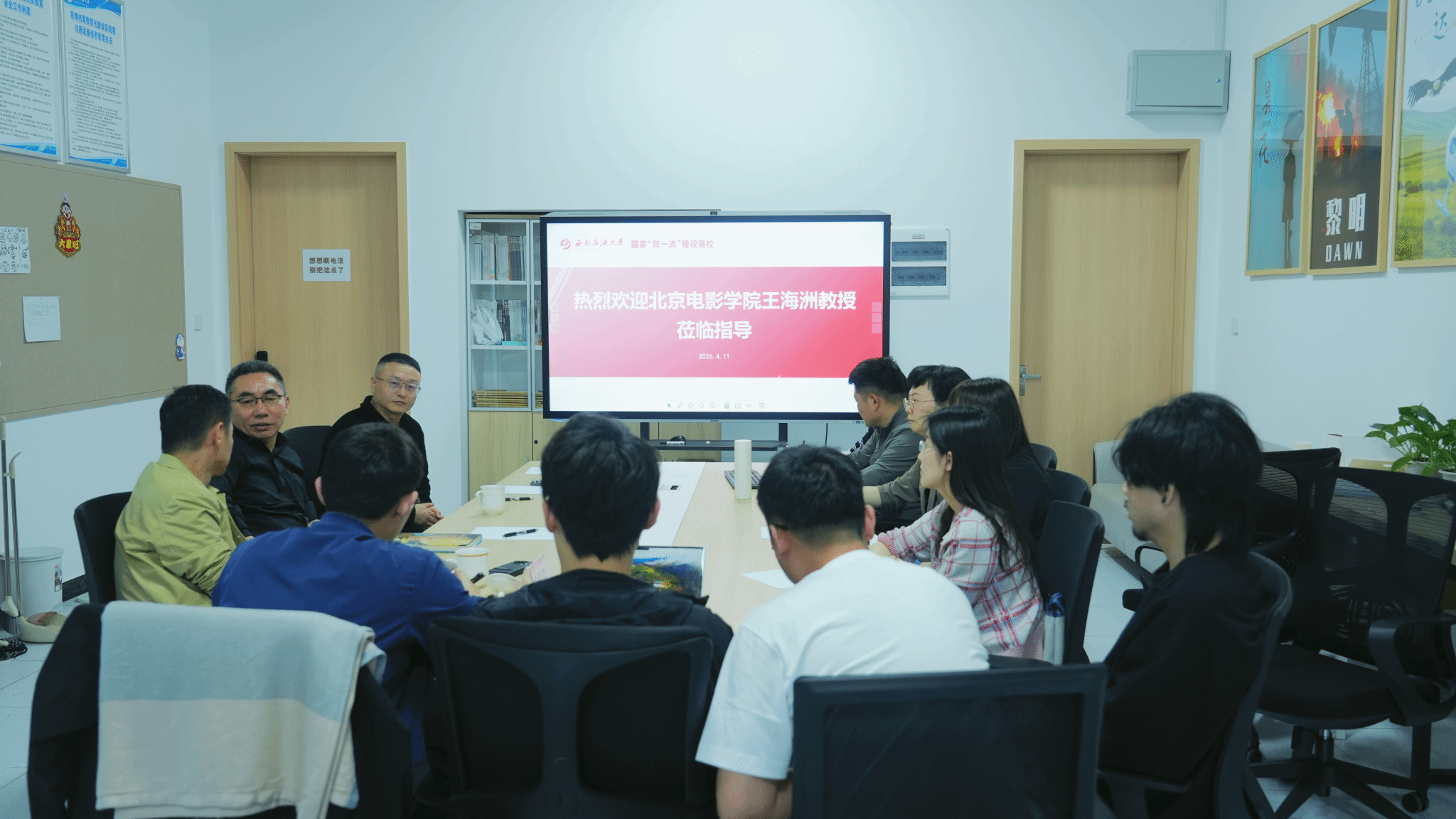 2026年4月11日,全国艺术专业学位研究生教指委委员兼戏剧与影视分委会召集人、教育部“长江学者”特聘教授、北京电影学院电影学系系主任王海洲教授应邀莅临西南石油大学艺术学院,与学院领导及教师代表开展座谈交流。艺术学院院长焦道利、副院长王韦皓,以及各教研室主任、专任教师共同参与本次座谈会,双方围绕学科建设、研究生培养、科学研究等核心议题进行了深入探讨与经验分享。