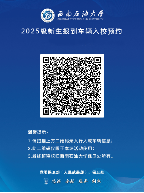 三、驾车前来的新生及家长朋友们,需提前在网上进行自主申请(可微信扫描“2025级新生报到车辆入校预约”二维码(见附图)申请,根据自身情况选择合适的入校时段,为给更多新生及家长提供便利,原则上每名新生仅能为一辆送行入校车辆选择一个时段进行预约,每辆车在报到期间仅能预约一次),经审核同意后,相关车辆可按预约时段从西大门(百度地图搜索“西南石油大学(成都校区)-西门”)入校(未预约或者不在预约时段内的车辆无法进入学校)。