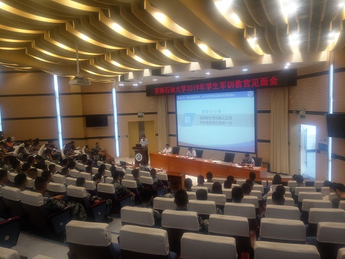 9月12日,西南石油大学2019级学生军训教官见面会在思学楼A114举行。学校武装部部长、2019级学生军训团团长邓洪波,学校学生工作部部长、2019级学生军训团政委蒲勇,中国人民解放军95607部队派驻我校带训领导、2019级学生军训团副团长兼副政委杨新平中校、2019级学生军训团副团长单睿上尉,2019级学生军训团副政委张祖宁上尉,体育学院党总支书记、2019级学生军训团副团长彭小华,学校学生工作部副部长、2019级学生军训团副政委陈俐宏,参训教官,各学院学生工作负责人与新生辅导员等出席。会议由武装部副部长、2019级学生军训团副团长江波主持。