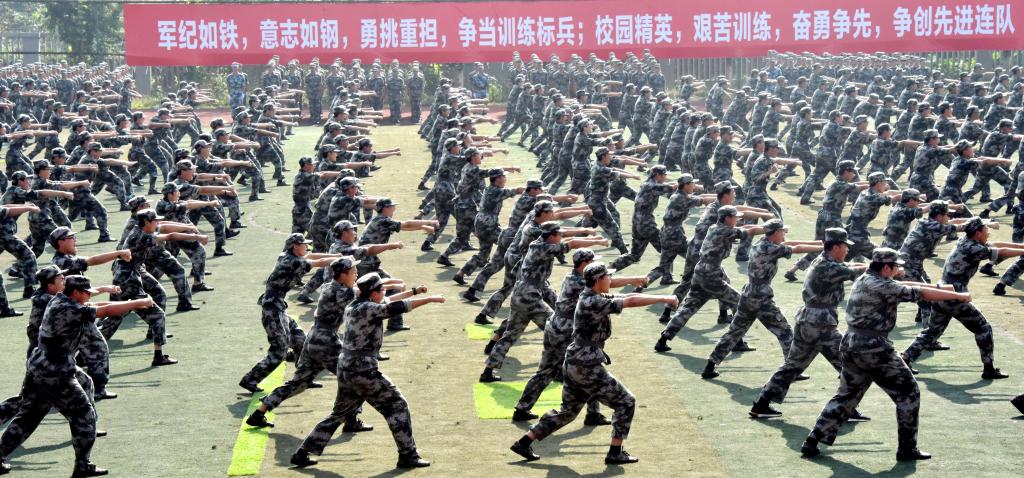 紧接着,擒敌拳方队,军体拳方队,匕首操方队依次登场。在嘹亮的喊杀声中,擒敌拳方阵入场,他们目光坚定,动作整齐划一,气势高昂,一招一式都彰显着军魂;军体拳方阵,动作精确无误,拳掌交加,步履稳健,一呼一息都流露出保家卫国的决心;由女生组成的匕首操方阵,在刀光剑影间,展现出“巾帼不让须眉”的风采。