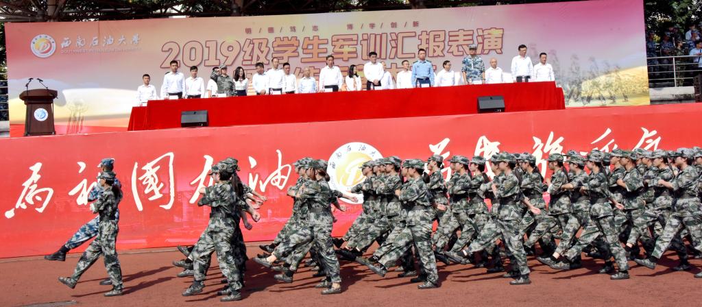 9月25日,成都校区2019级新生军训汇报表演暨总结表彰大会在二期田径场隆重举行。5844名新同学经过两周刻苦训练,圆满完成了军训任务。他们用精彩纷呈的汇报表演向学校交了一份满意的答卷,展现了石大学子意气风发、斗志昂扬的精神风貌。