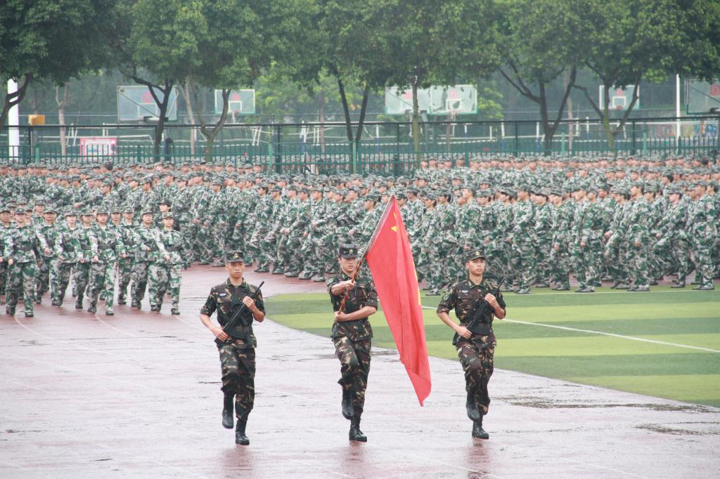 奏唱国歌后,汇报表演总指挥下达迎军旗口令,旗手擎旗、护旗手护旗自北向南正步通过主席台,教官行举手礼,各方队学生行注目礼。