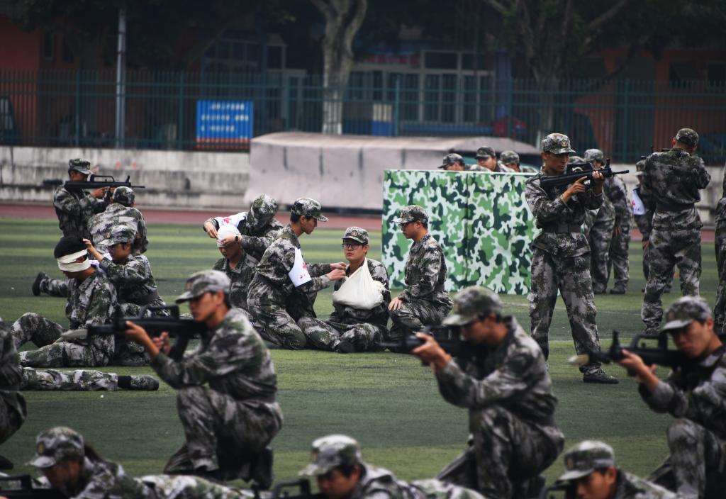 迎军旗仪式后,阅兵式开始。举字方阵、刺杀操方阵、匕首术方阵、战场救护方阵依次登场,他们目光坚定,步履矫健,动作整齐,气势高昂,彰显了新时代青年大学生昂扬向上、保家卫国的精神风貌。