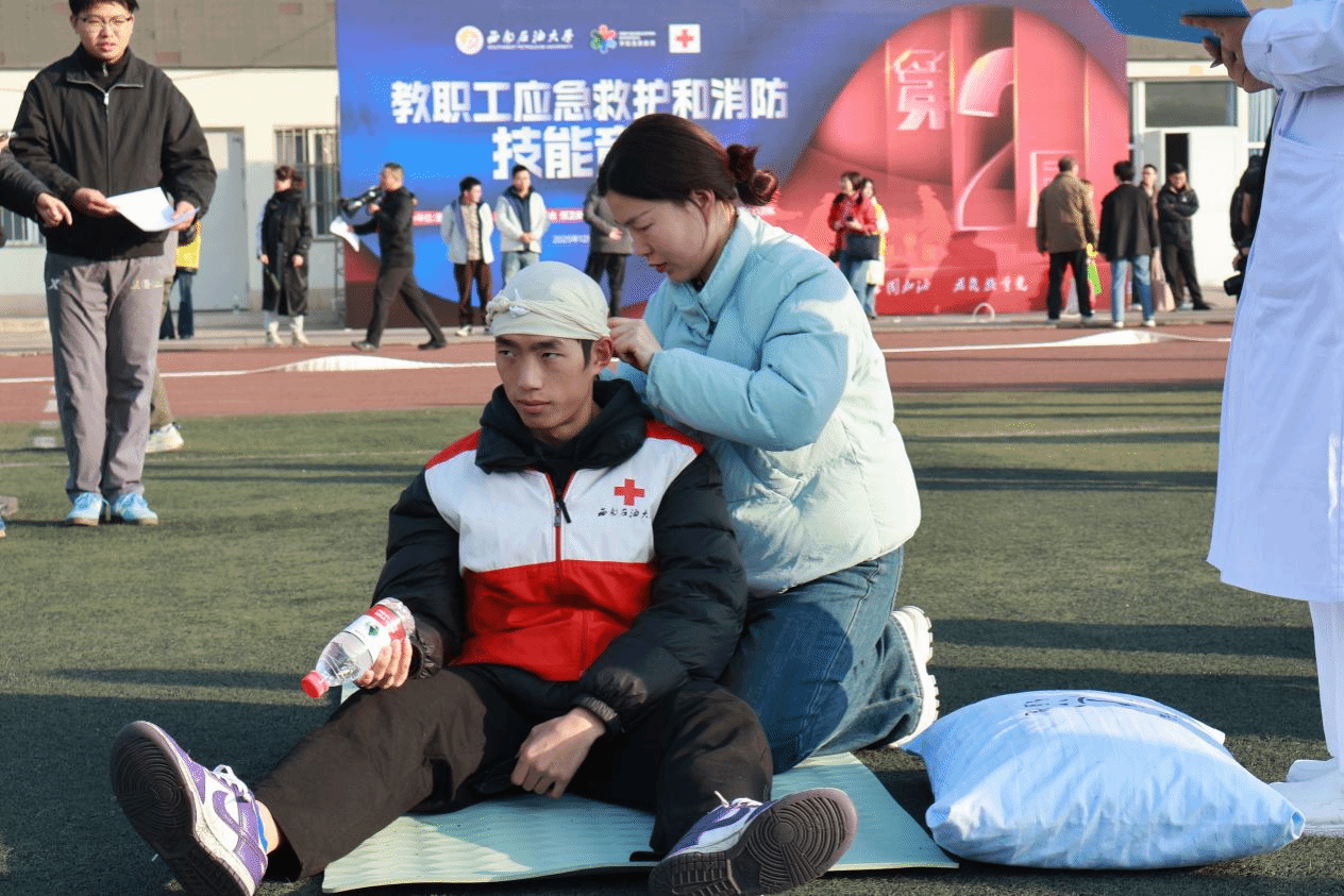 随着计时器的“滴”声响起,参赛选手迅速进入状态:跑道上,选手们迅速连接水带、水枪,熟练制作绳结,跑向灭火区完成灭火;操场上,选手们评估环境、做好防护、伤口包扎固定、心肺复苏……参赛选手争分夺秒,有条不紊,认真按照操作规范实施应急操作。担任评委的保卫处工作人员和校医院医务人员认真记录,严格按操作规范评估给分。