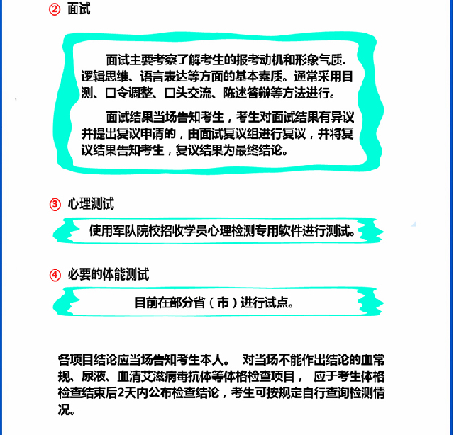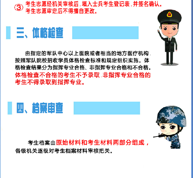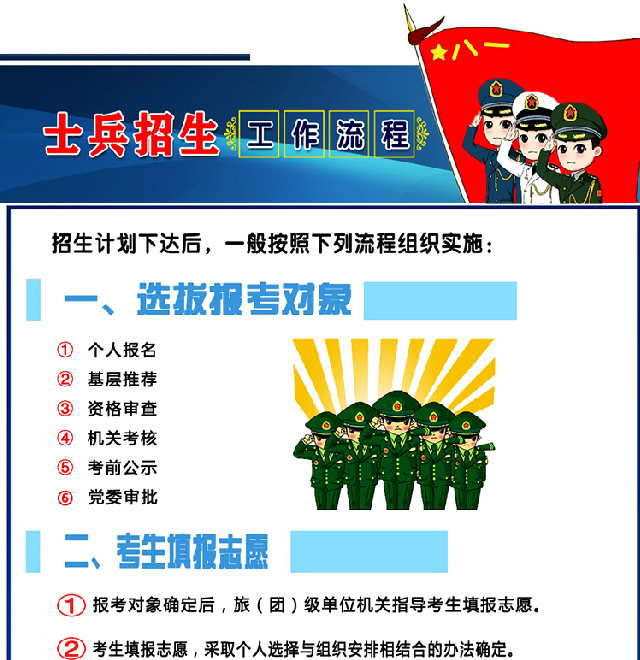 答:主要分为生长干部招生和士官招生。生长干部招生主要包括军队院校招收普通高中毕业生、招收士兵和依托普通高校招收国防生。士官招生主要招收参加职业技术教育的士兵学员,分为高技能人才培养、高等职业技术教育、中等职业技术教育、任职技能培训4个层次。目前,各类别招生计划已经下达相关单位并向社会公布,招生业务人员培训结束,招生工作全面展开,军队招生部门与有关院校、地方高校密切协调,高中毕业生报名各项准备进展顺利。部队考生资格审查完毕,军事科目考核正有序进行。