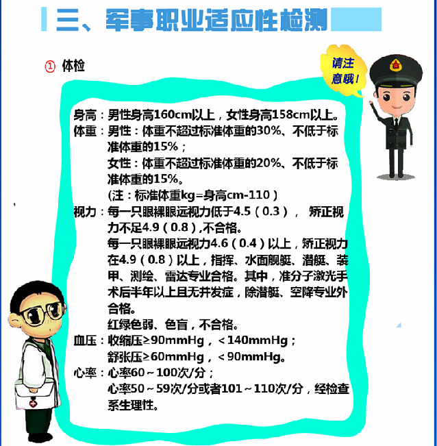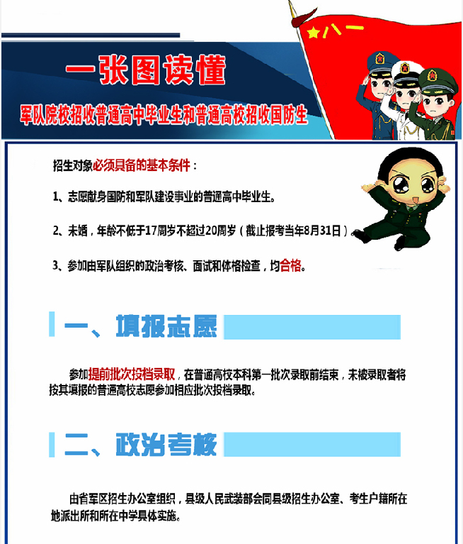 答:基本条件:志愿献身国防和军队建设事业的普通高中毕业生,年龄不低于17周岁、不高于20周岁(截止报考当年8月31日),未婚,参加由军队组织的政治考核和军事职业适应性检测,均合格。报考飞行、机要、刑侦、艺术等专业的特殊要求,以招生计划或院校招生章程公布为准。考生报名参加全国普通高校招生统一考试,填报军队院校和国防生志愿,通过政治考核和军事职业适应性检测,参加投档录取,被录取后按要求入学报到,参加复检复查,合格者取得学籍。