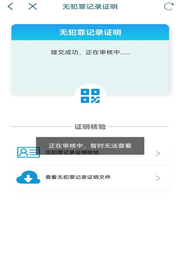 7、提交完成后,系统提示“提交成功,正在审核中......”(正在申请中的证明二维码暂时不可点击)