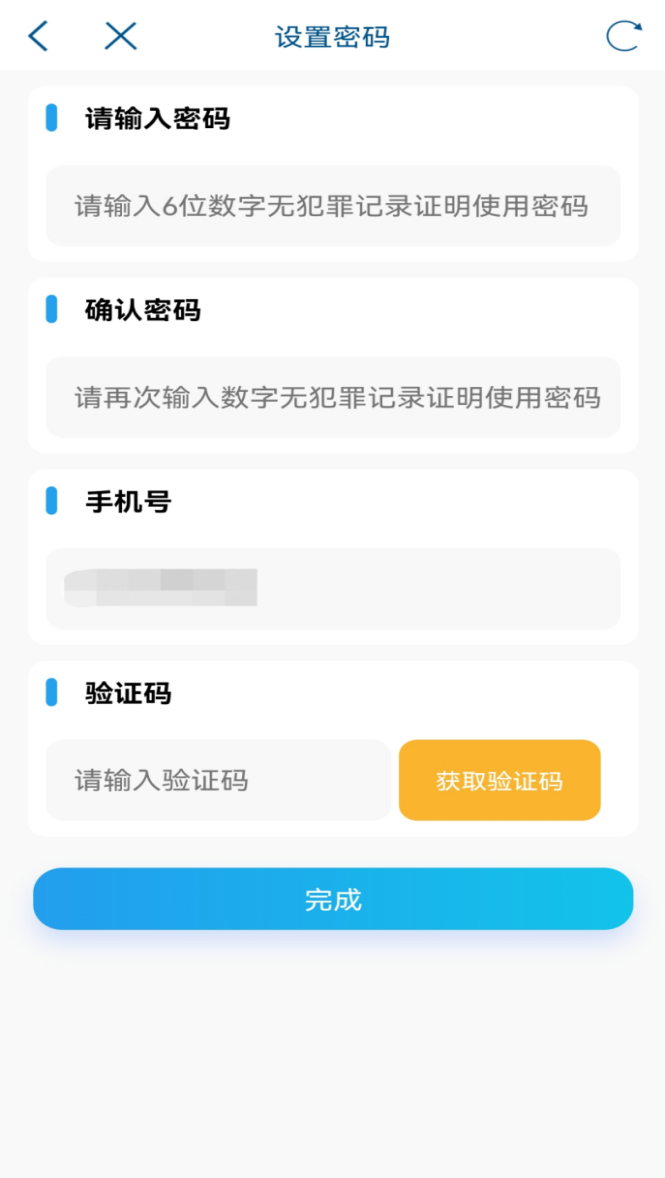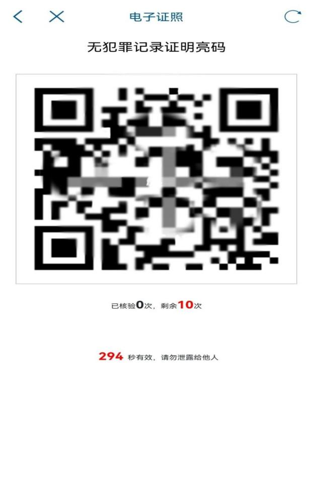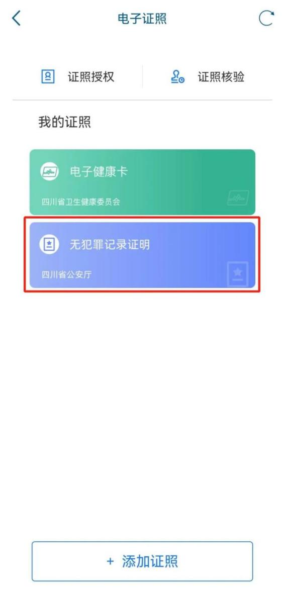 4、添加完成后返回电子证照页面,此时“无犯罪记录证明”添加成功,选择此证明,进入密码设置页面。根据提示输入设置亮证密码、输入手机验证码。