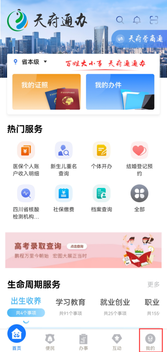 1、下载“天府通办”APP 后,点击“我的”进入登录页面。