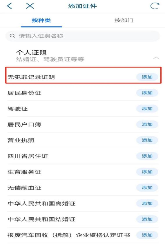 3、点击“添加证照”,在“个人证照”菜单栏下拉选项中选择“无犯罪记录证明”点击“添加”。(也可以根据名称或按部门查找)