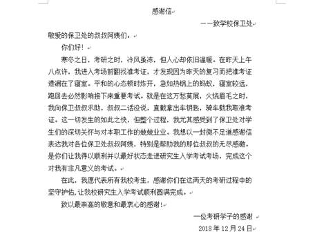 2018年12月23日7时48分,在我校思学楼参加考试的考生谢某到考场才发现自己的准考证遗忘在寝室,而此时考试即将开始,该考生焦急万分,向周边执勤的安保人员求助。鉴于时间紧迫,巡逻班班长立即驾车带考生赶回寝室取回准考证,最终考生准时抵达考场,顺利参加考试。为表示感谢,谢某递交了感谢信。