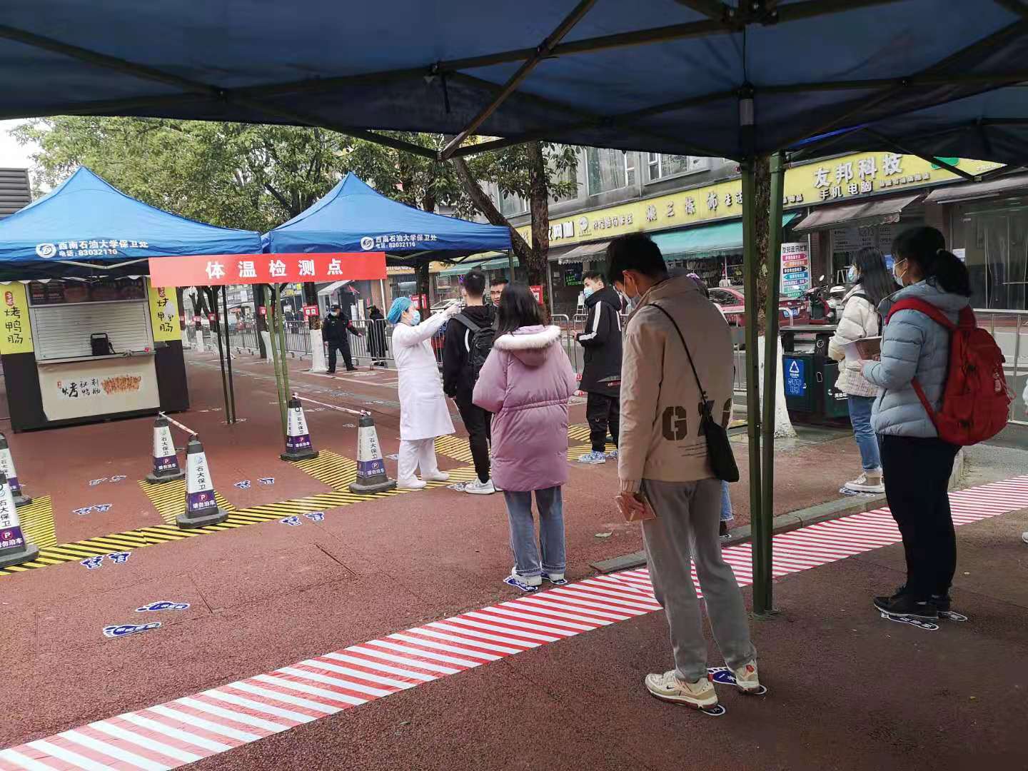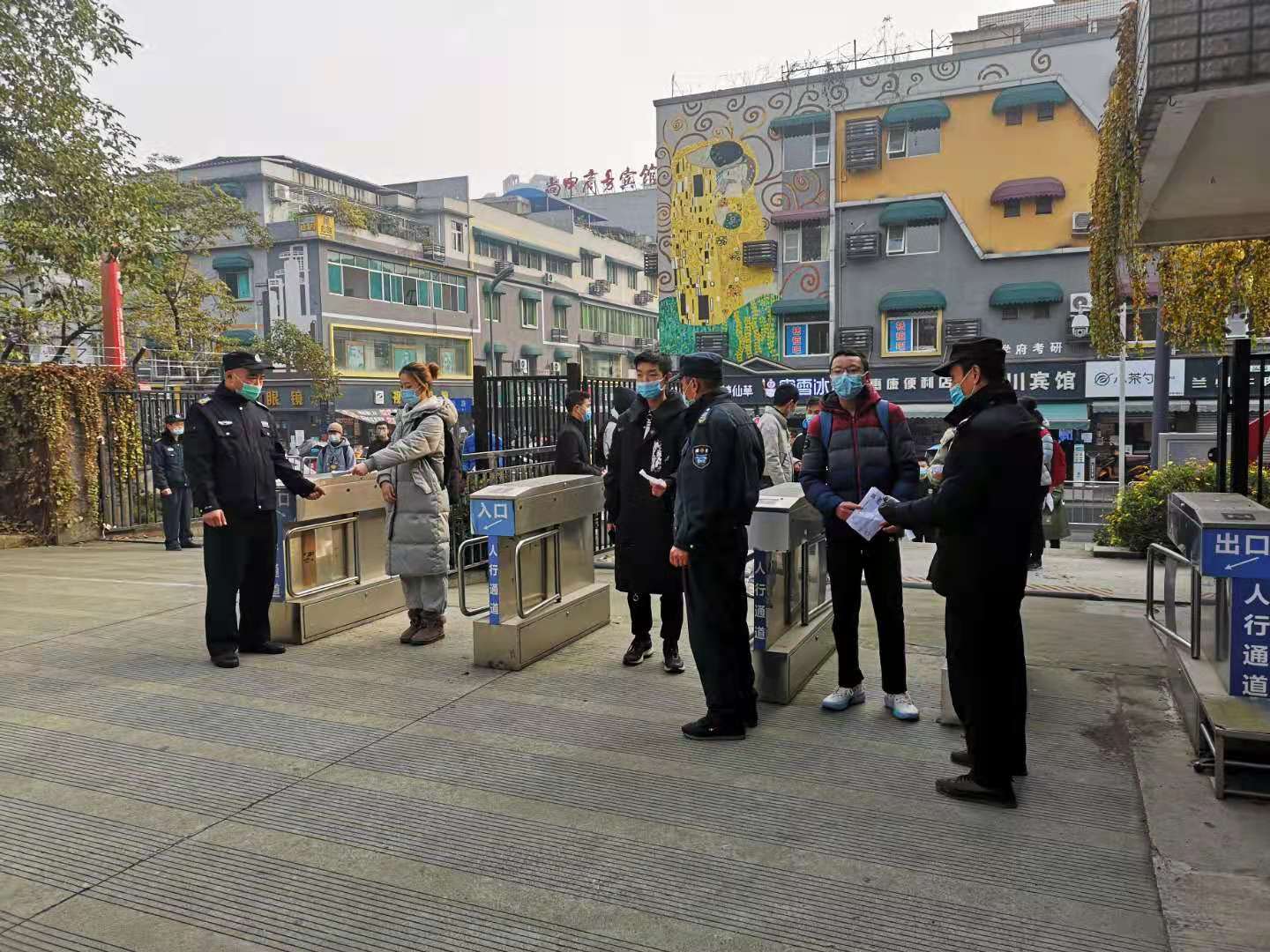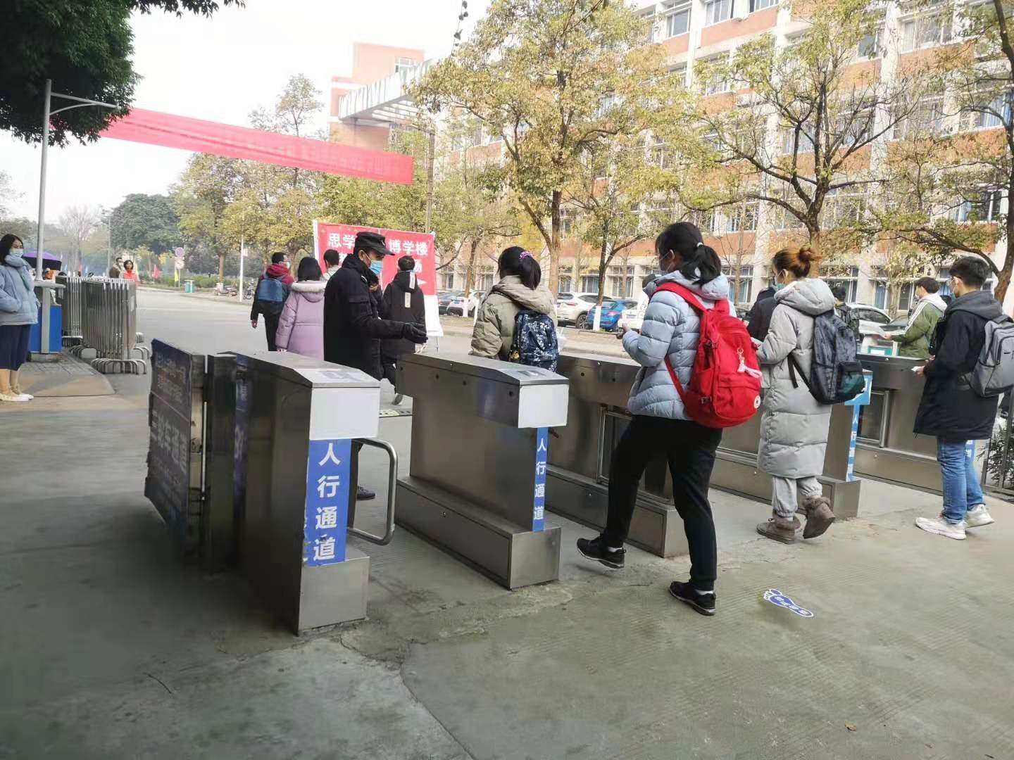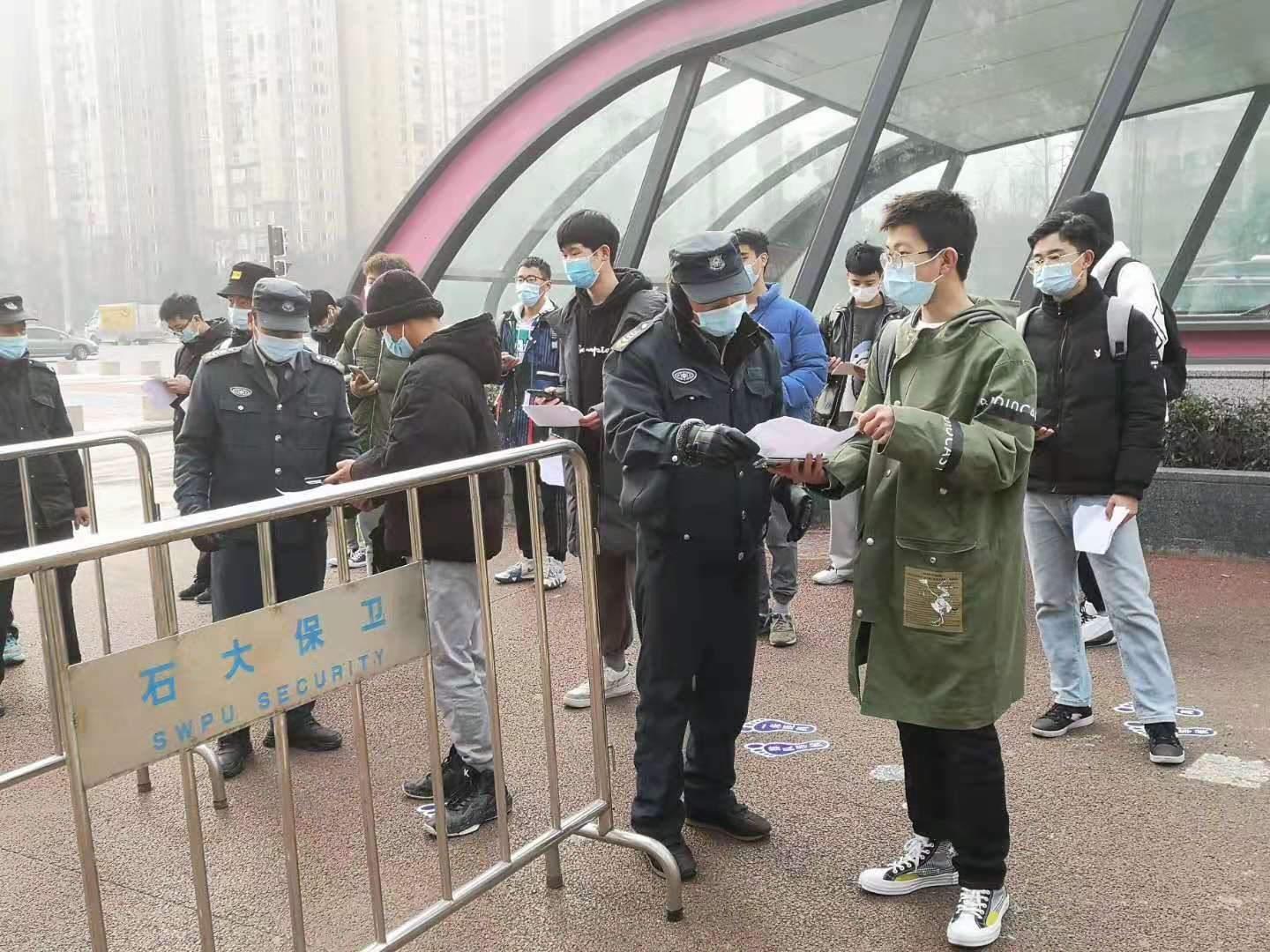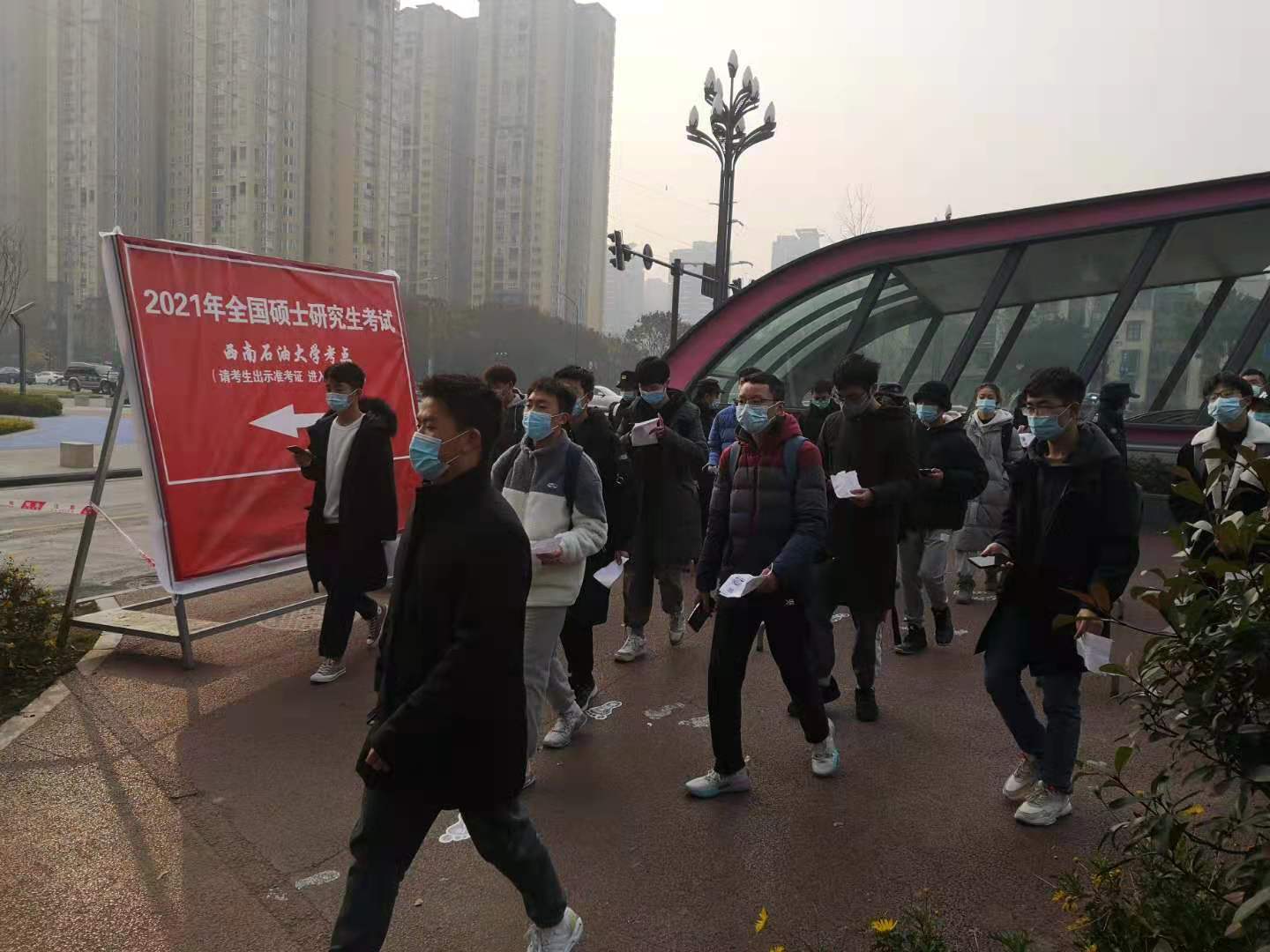 在地铁三号线石油大学站D口,设置进校入场专用通道,并由保安在入口处核验考生准考证、维持秩序,引导考生根据地上标识互相保持1m以上距离,有序进场。