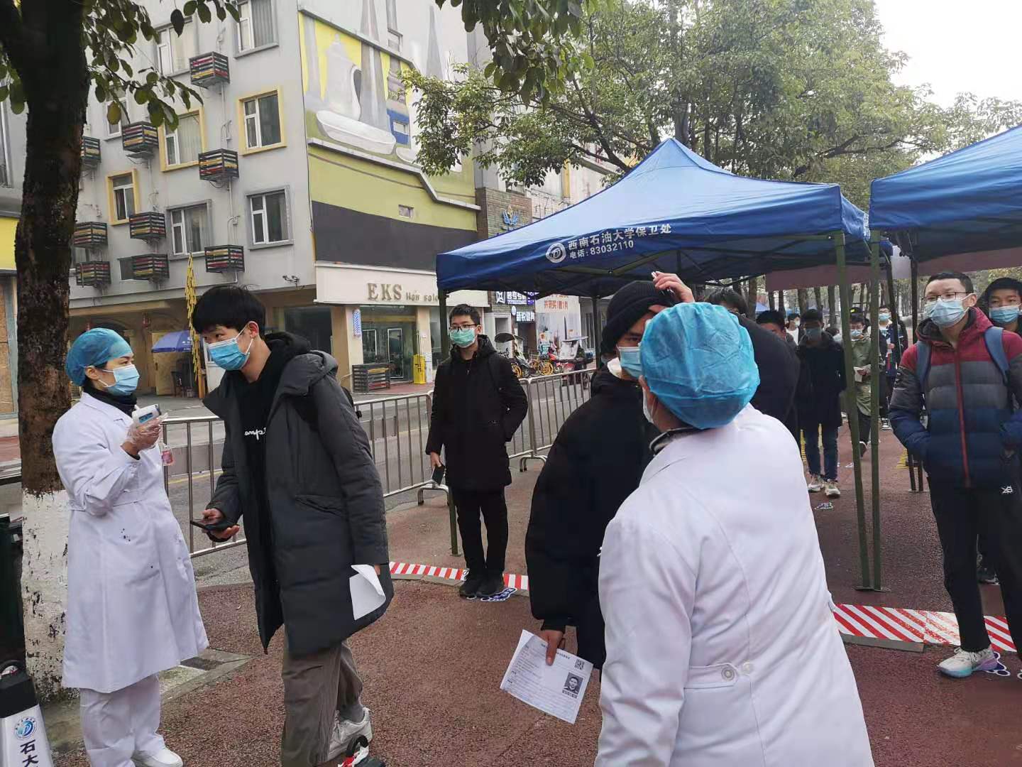 在体温检测点处,校医院工作人员对考生进行体温检测,考生体温无异常方可通过。