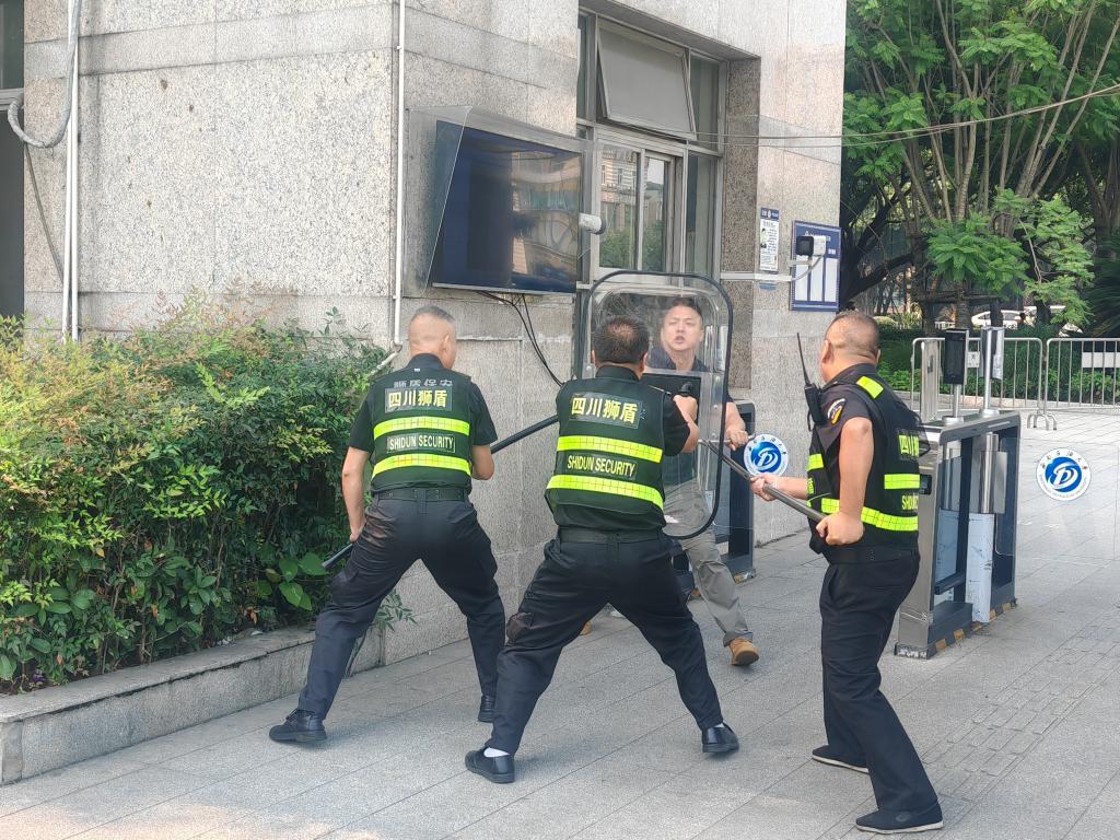 实战演练中,一名“歹徒”持刀在南大门欲强行冲入校园,执勤保安发现异常情况后分工合作,一边组织疏散人群、报警求援,做好相关区域警戒工作,一边启动突发事件应急处置预案,使用防暴盾牌、钢叉、防暴棍等装备与该“歹徒”展开周旋,最终在大家的紧密配合和果断处置下,该“歹徒”被逼进死角并成功制服,现场秩序得以恢复。整个演练过程组织有序、分工明确、配合默契、处置妥当,达到了预期效果。