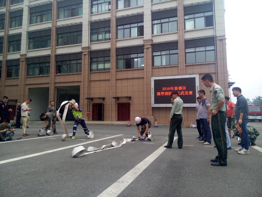本次竞赛共有10余支新都区消防重点单位队伍参与原地着灭火服、一人两盘水带连接、室内消火栓连接三个项目的角逐,比赛现场气氛紧张热烈。