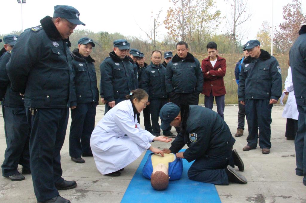 在培训中,消防官兵首先带领参训队员参观了消防车辆、各类应急救援器材和消防科普教育室,为大家介绍了各种消防救援器材的使用方法,普及了很多消防安全基础知识,随后向参训人员详细讲解了初期火灾处置程序、方法和注意事项,并现场演示了各类灭火器、消防栓、便携式呼吸面罩等常见消防器材的使用方法,最后组织安保人员使用灭火器进行了油盆灭火实战演练。校医院医护人员通过专业知识讲解与现场示范相结合的方式为参训人员传授了心肺复苏、人工呼吸等应急救护知识,在培训中医护人员与参训人员频繁互动,通过示范操作和练习,让每一名学员掌握了基本的应急救护技能。