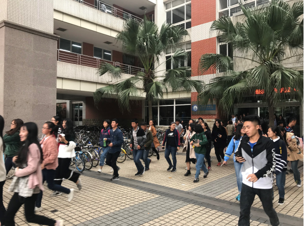 在视频学习之后,同学们进行了五分钟的准备。随后警报拉响,大家按照事先规定好的队伍和路线有条不紊的撤离教室,迅速到达广场。撤离行动做到了井然有序的同时,也保障了安全又保证了速度。