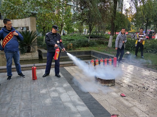 活动中,保卫处工作人员和消防志愿者为居民们准备了内容丰富的消防安全展板,发放了《消防常识二十条》、《消防安全知识读本》,印有消防安全知识的鼠标垫、一次性雨衣,围裙等千余份宣传资料和小礼品;消防志愿者们还根据展板和宣传手册的内容,详细为社区居民讲解了家庭用火、用电的一些常识,以及油锅发生火灾、电气火灾处置方法,并以有奖问答的形式向现场群众普及了防火、灭火知识和逃生自救常识,激起了大家的参与热情。同时,学校微型消防站的应急抢险车辆装备也在本次活动中闪亮登场,工作人员通过现场演示消防摩托车随车装备、细水雾灭火装置使用、消防员个人防护装备穿戴等科目,介绍了学校配备的各类消防器材和微型消防站建设成果。活动最后,志愿者们还组织居民和后勤物业安保人员进行了灭火器实操训练,,并邀请在场群众现场使用灭火器体验扑灭初期火灾。