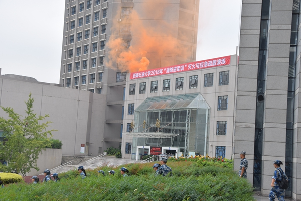 图书馆门口聚集所有18届的新生进行演习和观摩,这是新生观看消防宣传片后的自我检验。时间一到,滚滚浓烟”在图书馆上空升起,自动消防系统开始报警,刺耳的警报响起。消防广播通知新生进行撤离,新生代表用手捂住口鼻,从室内跑出,值班人员立即向“119”和学校报警中心报警,说明火灾地点、部位、燃烧物质、有无受困人员等相关情况,并第一时间向校医院请求救援。同学们在教官的引导下站在指定的安全位置,并观摩消防官兵如何灭火及进行营救。消防车从远处开来,消防员紧凑的从车内跑出,拿出消防栓,向浓烟底部处喷去,这次消防演习到了尾声。整个过程紧凑而有序,为同学们还原了一个真实火灾发生的场景。这一次演习,同学们认真的观看,并掌握了很多与消防安全相关的知识和技能。