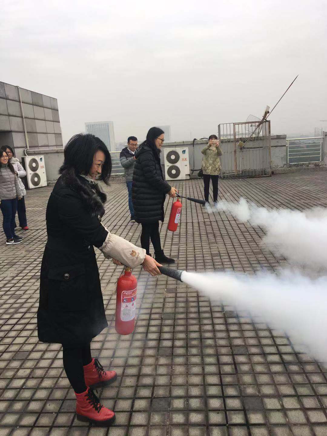 在培训会上,我处工作人员从校园火灾危害性、保密室火灾隐患及重点防控点、单位日常防火要点三个方面介绍了相关消防法规、保密室火灾隐患及整改措施、教职员工应当承担的消防安全责任与义务、初期火灾处置方法、火场逃生自救技巧等知识。最后,工作人员还组织全体参训职工在图书馆屋顶进行了灭火器实操培训。
