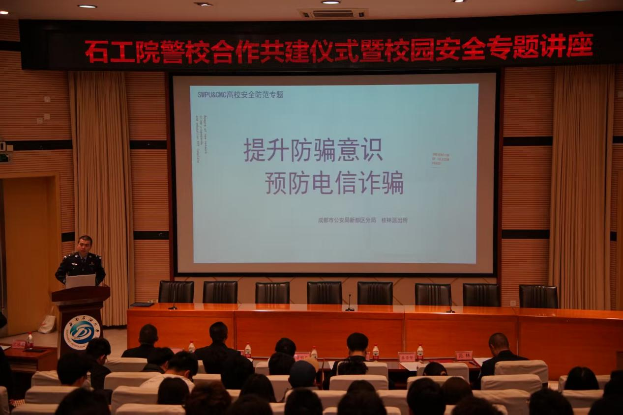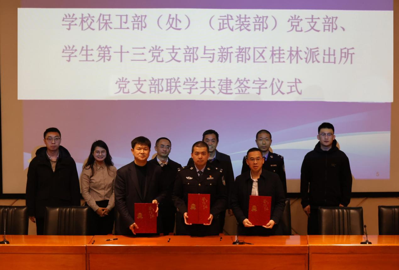 共建仪式上,学校保卫部党支部、石工院学生第十三党支部与新都区桂林派出所党支部签订了共建协议。按照协议,桂林派出所党支部每月与校保卫部党支部、学生党支部召开联席会议,沟通情况,研究工作;在“一站式”学生社区设立“校警联络站”,每月开展反诈宣传和安全巡查,联合开展“学生社区安全员”培训、反诈情景剧大赛等特色活动。