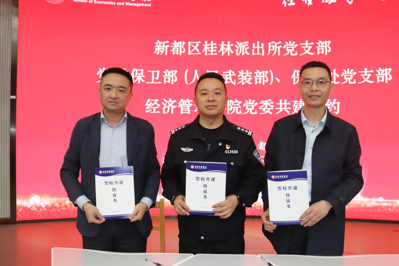 新都区桂林派出所、保卫处、学院三方代表举行了共建签约,并向新都区桂林派出所指导员丁健、民警寇浩分别颁发法治副书记、法治辅导员聘书。