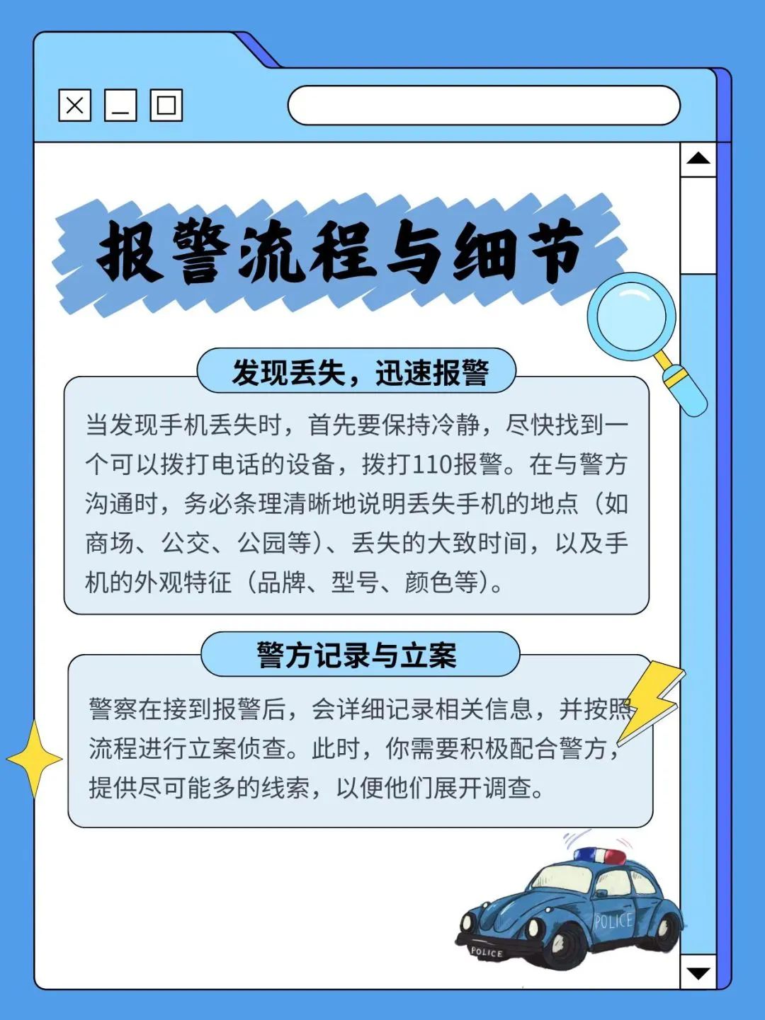 最后一定要记住,发现手机丢失后请迅速拨打报警电话,公安机关会在第一时间赶到现场进行调查。