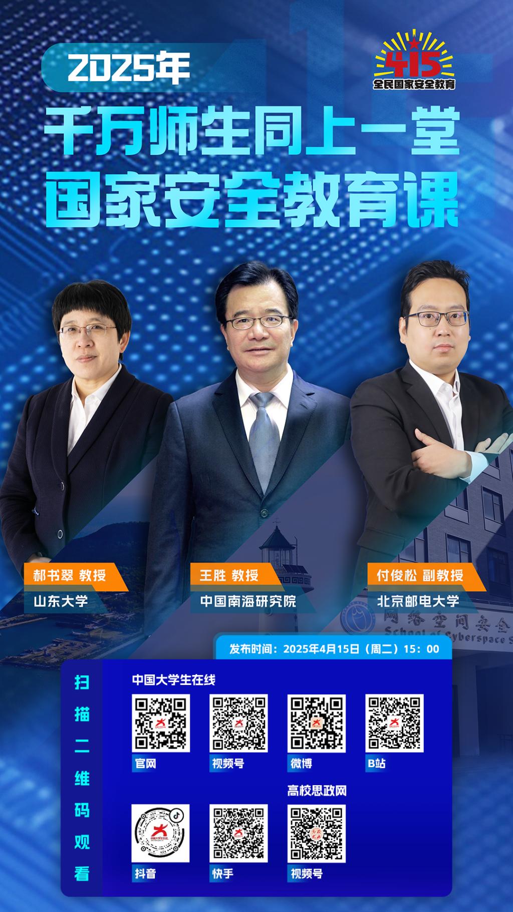 在第十个全民国家安全教育日到来之际,在教育部思想政治工作司指导下,中国大学生在线面向全国高校师生推出《千万师生同上一堂国家安全教育课》,采取线上发布课程的形式,邀请中国南海研究院王胜教授、山东大学马克思主义学院(威海)郝书翠教授、北京邮电大学网络空间安全学院付俊松副教授联合讲授。2025年4月15日15时,师生可通过中国大学生在线官网、视频号、微博、B站、抖音等直播平台观看。