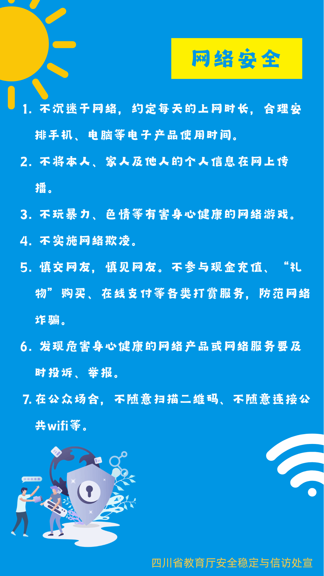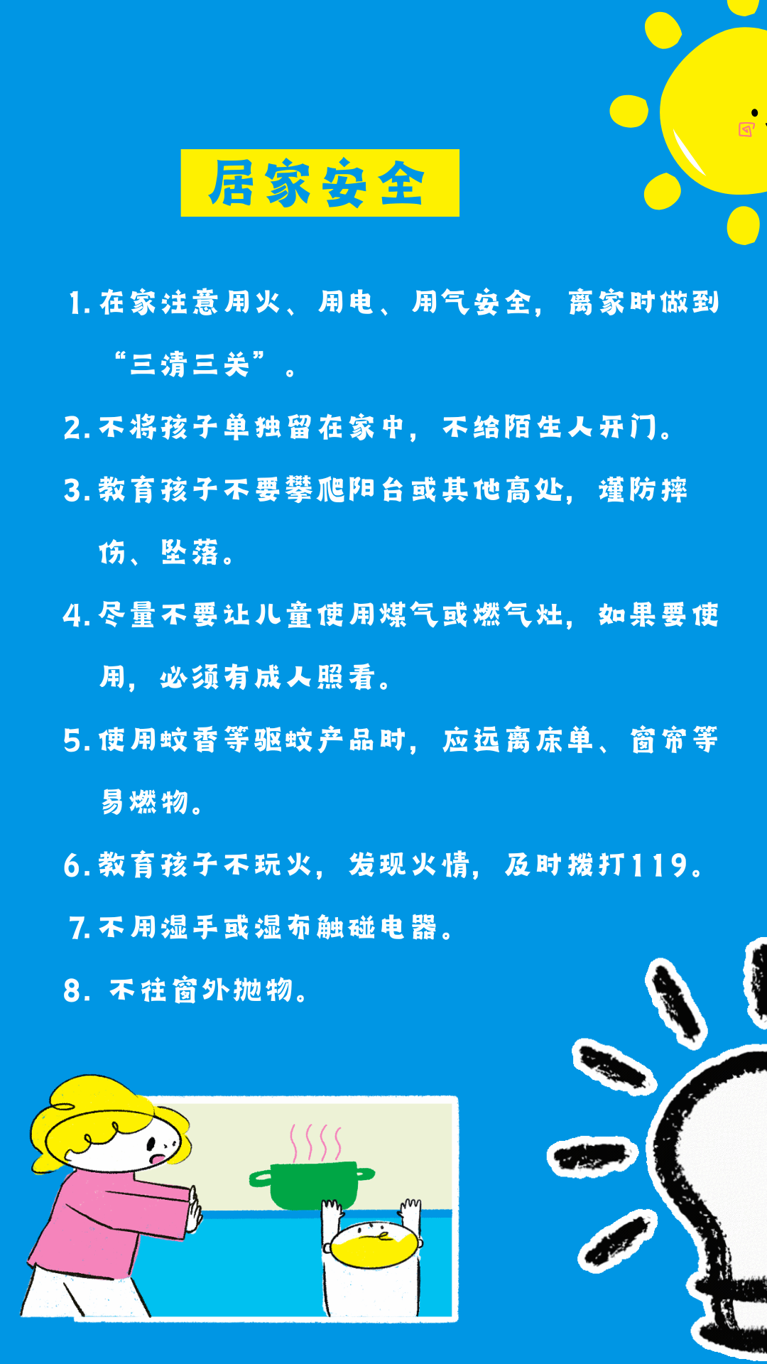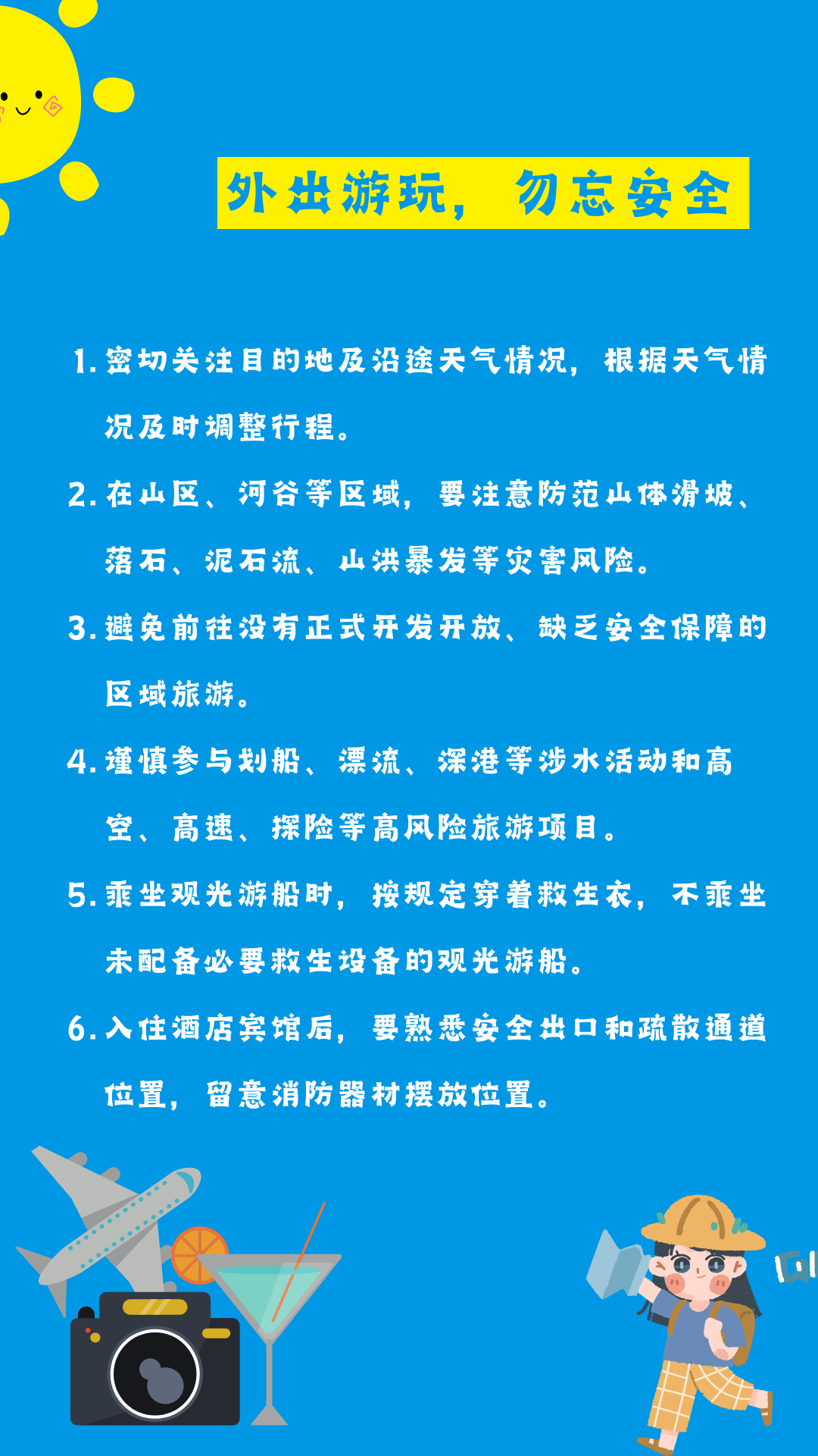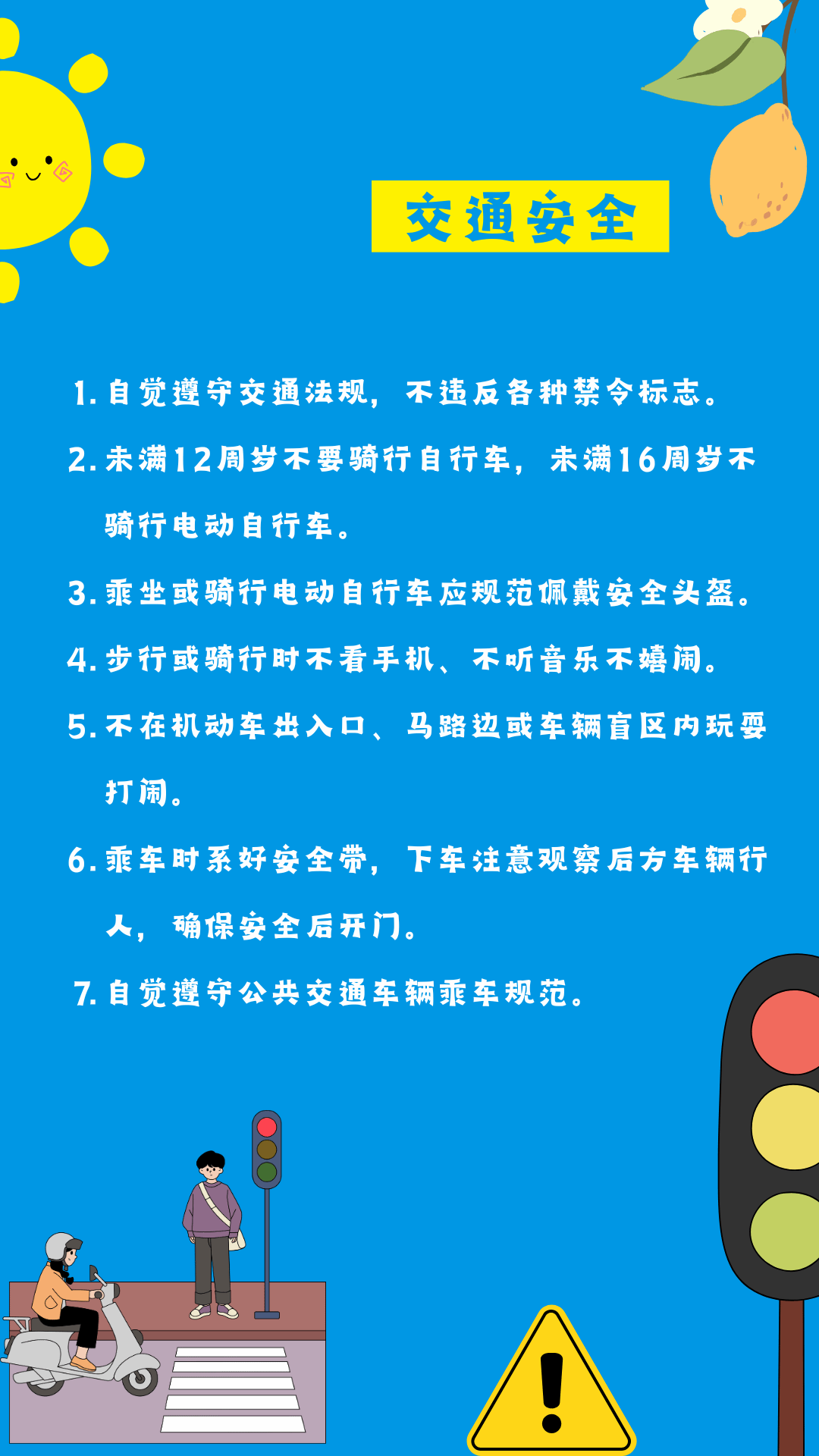 健康安全:规律作息,谨防意外安全要点:保持健康作息,适度娱乐;注意饮食卫生;夏季高温,谨防中暑;游泳选择安全场所,避免野泳;注意雷雨、台风等极端天气预警。