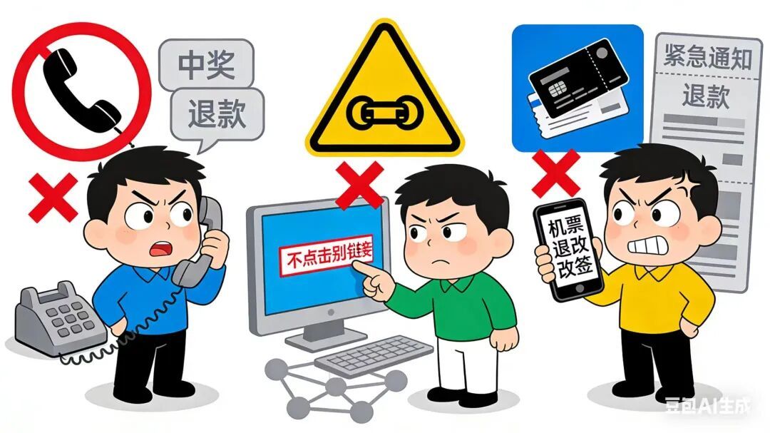 7.警惕机票、车票退改签诈骗。如遇客服以航班、车次延误或取消联系你并主动要求理赔,请到官方平台进行核实。