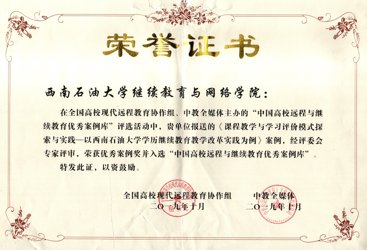 2019年10月17-18日,在北京新世纪日航饭店召开了2019中国国际远程与继续教育大会。会议由全国高校现代远程教育协作组、中教全媒体共同主办。会上,对入选第四届“中国高校远程与继续教育优秀案例库”的单位进行了表彰奖励。本次案例征集共收到各类案例400余篇,经过专家初审、互审,专家讨论,115项具有代表性优秀案例最终入围。我校提交的《课程教学与学习评价模式探索与实践——以西南石油大学学历继续教育教学改革实践为例》案例,荣获优秀案例奖并入选“2019中国高校远程与继续教育优秀案例库”。