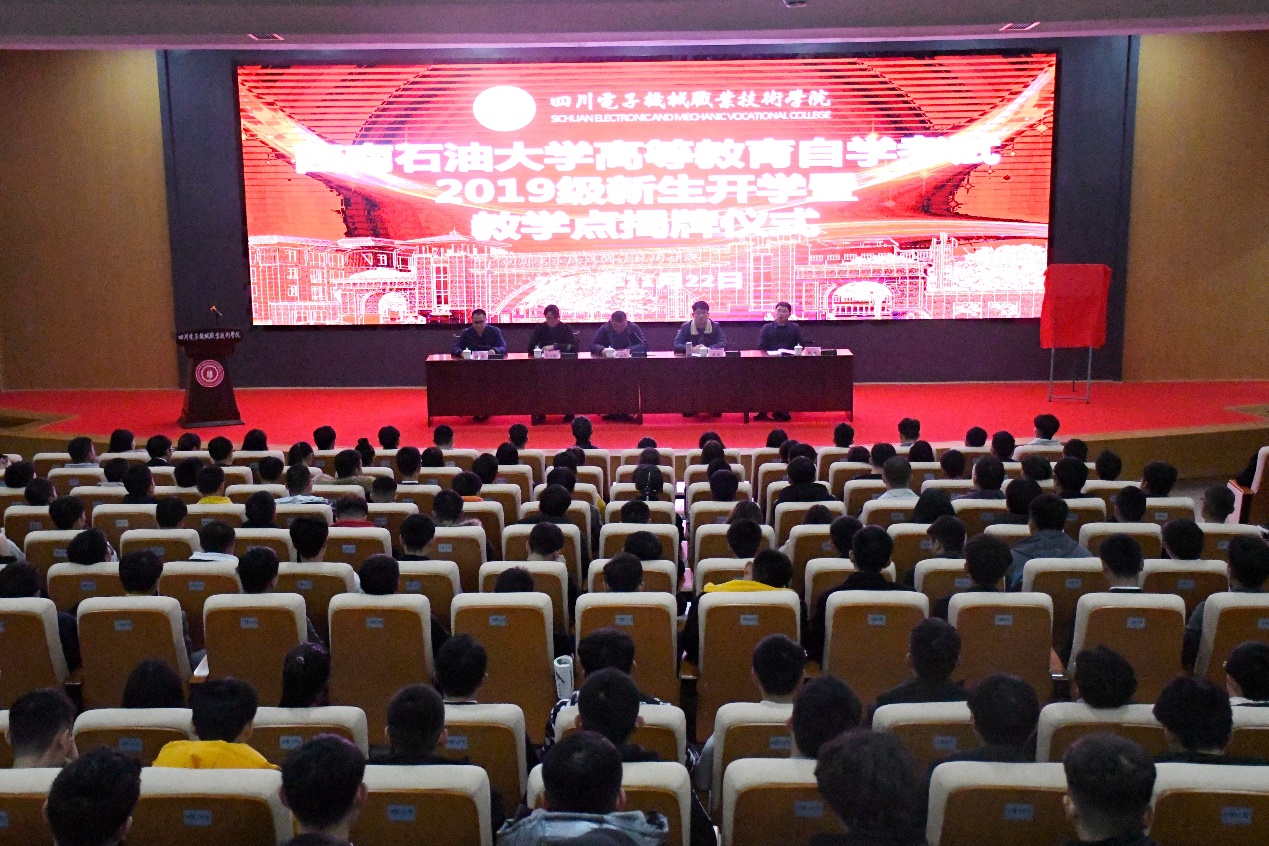 2019年11月22日下午4:30,我校高等教育自学考试四川电子机械职业技术学院教学点揭牌暨2019级新生开学仪式在四川电子机械职业技术学院学术报告厅隆重举行。院长汤富荣、副院长阮雪梅,四川电子机械职业技术学院副院长黄艺、院长助理、教务处长熊峰、继续教育处长赵勋出席了本次仪式,我校自考学习服务中心的老师以及近400名2019级自考专升本新生参加了本次活动。