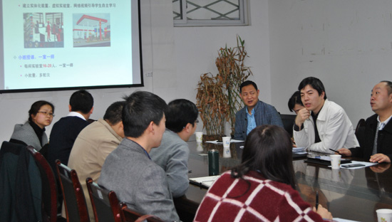 2015年3月25日上午,西华师范大学化学化工学院院长刘全忠、实验设备处副处长田茂洁、化学化工学院副院长杨秀培、实验室主任秦大斌等一行7人来实验中心进行交流调研。交流会由化学化工学院院长叶仲斌主持,党委书记陈馥、副院长段明,学校实验室与设备管理处副处长吴雁等出席会议。交流会上,实验中心常务副主任朱鹏飞首先代表实验中心对中心的师资队伍情况、实验教学管理与仪器设备管理情况及实验系列岗位工作量计算与考核办法进行了介绍。之后,双方主要就实验中心人员管理、物资管理、实验教学安排、实验教学改革、竞赛培训情况等情况进行了详细深入的交流和探讨。院长助理李敏、实验中心副主任卿大咏、中心教师王娜、张富晓等参加座谈。 |