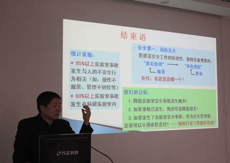 实验室安全管理与防范工作是各高校加强实验室安全管理、创建绿色平安学校的一项重点工作。我校化学化工国家级实验教学中心一直高度重视实验安全的宣传、教育和管理工作。利用我校承办四川省第一届大学生化学实验竞赛工作期间,化学化工国家级实验教学中心举办了“四川省高校化学化工类实验室工作研讨特邀报告会”,并邀请到了全国高校实验室工作研究会副理事长兼技术安全委员会主任、浙江大学实验室与设备管理处处长冯建跃研究员来校作实验室安全方面的特邀报告。本次特邀报告受到了学校科研处与实验室设备管理处的大力支持,校内各实验中心、研究室负责人和实验技术人员代表参加了会议。报告的成功举行一定程度上加强了学校的教学、科研实验室安全管理,强化了实验室责任人和操作人员的安全意识,进一步普及了实验室安全知识。一些老师在听完讲座后纷纷表示,掌握基本的实验室安全知识是非常必要的,了解实验室操作规程、学会及时解决和处理突发事件也是一门必修实验技能课,冯建跃处长的报告让大家受益匪浅。
