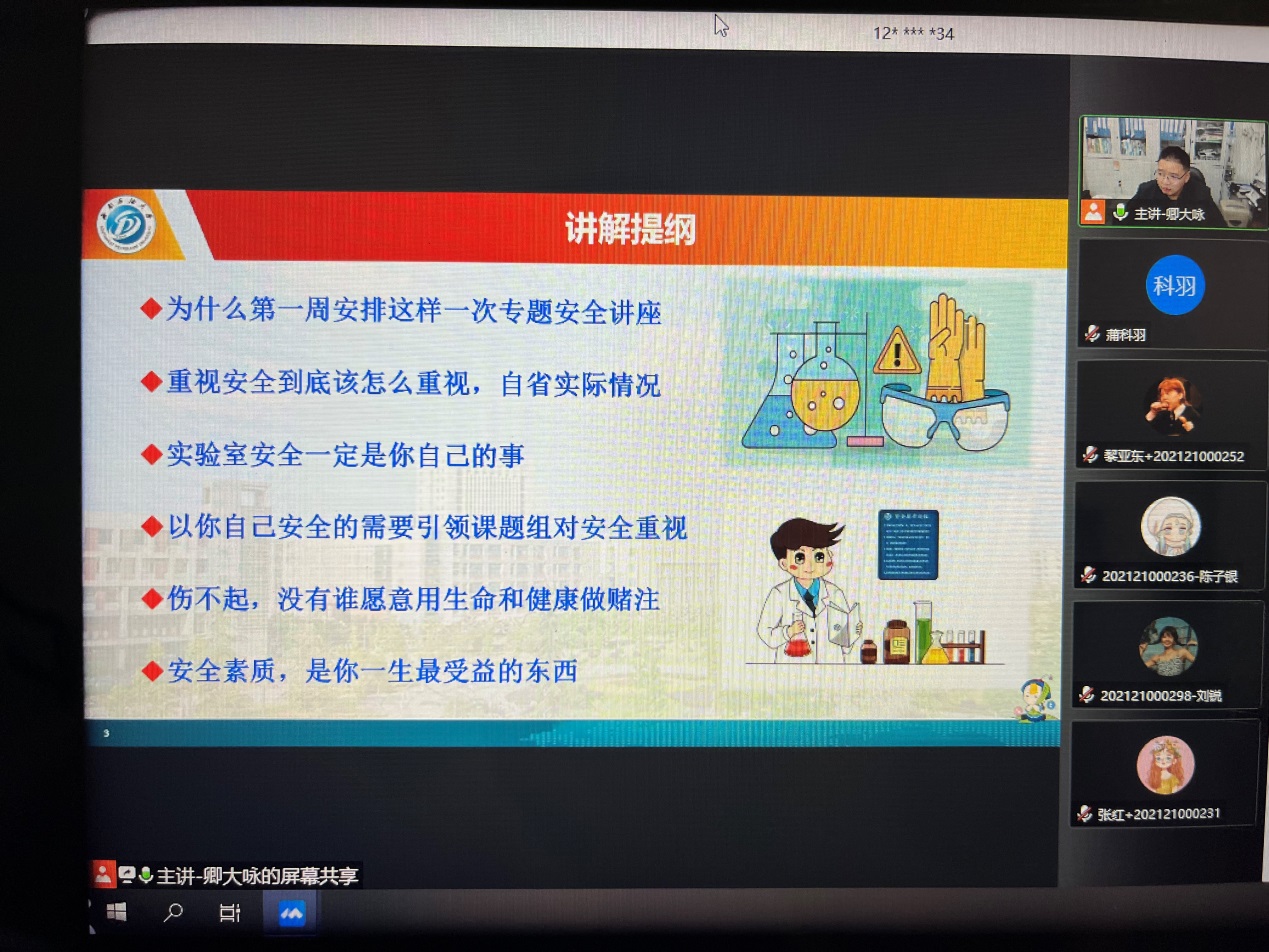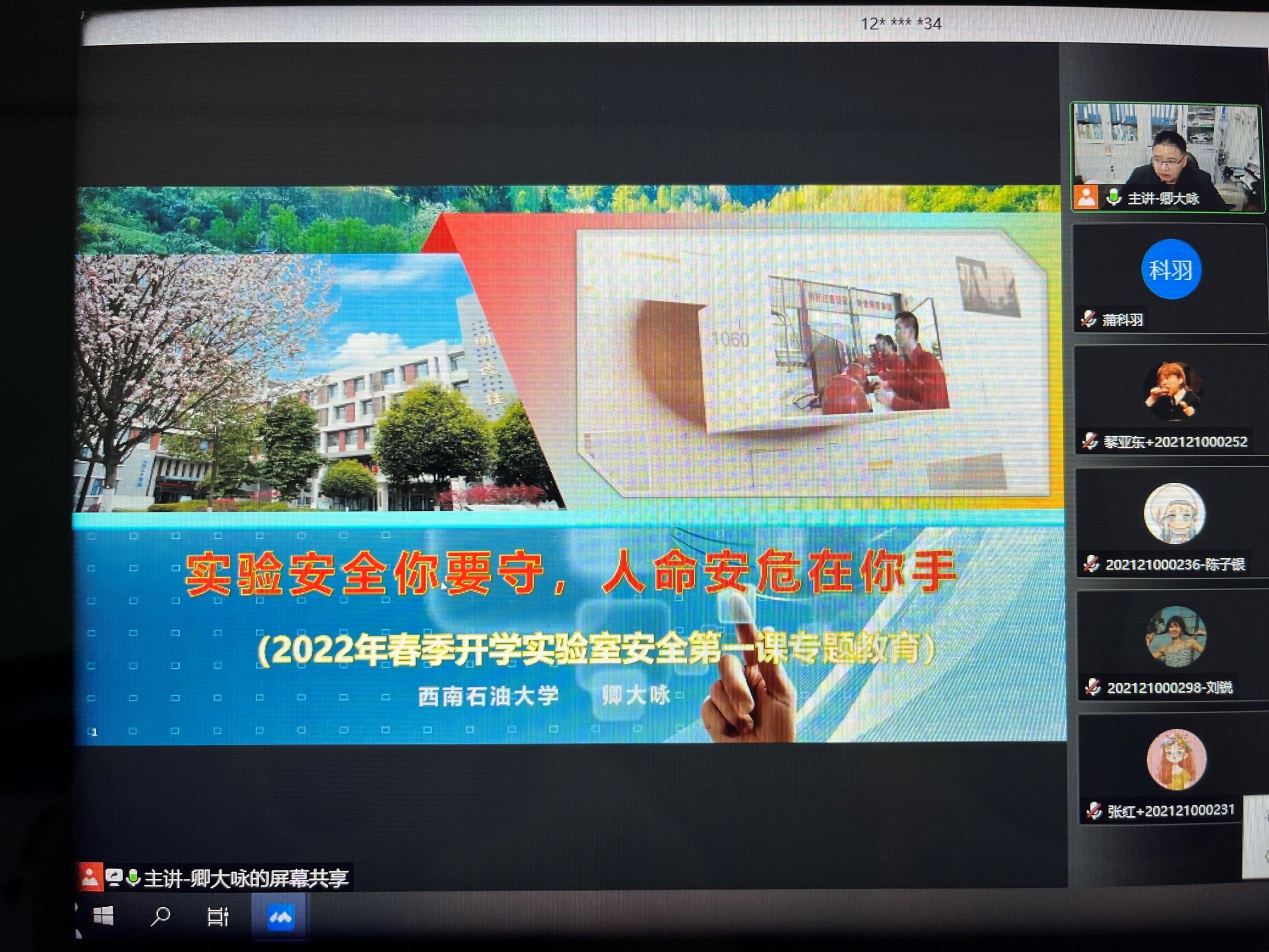 3月2日晚,化工院实验中心为全体硕博研究生开展了线上“2022年春季开学实验室安全第一课专题教育”讲座,共计300左右学生参加了本次线上讲座。实验室安全第一课专题教育由实验室分管安全工作副主任卿大咏主讲,安全管理员赵徊洁和蒲科羽一同参加了此次讲座。
