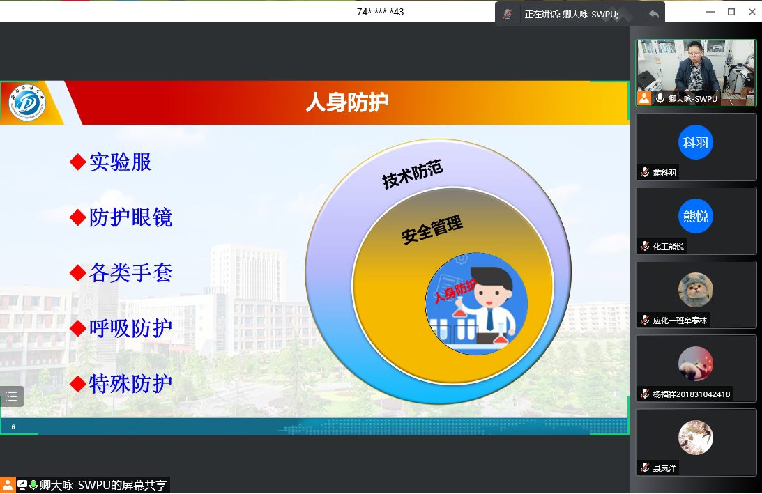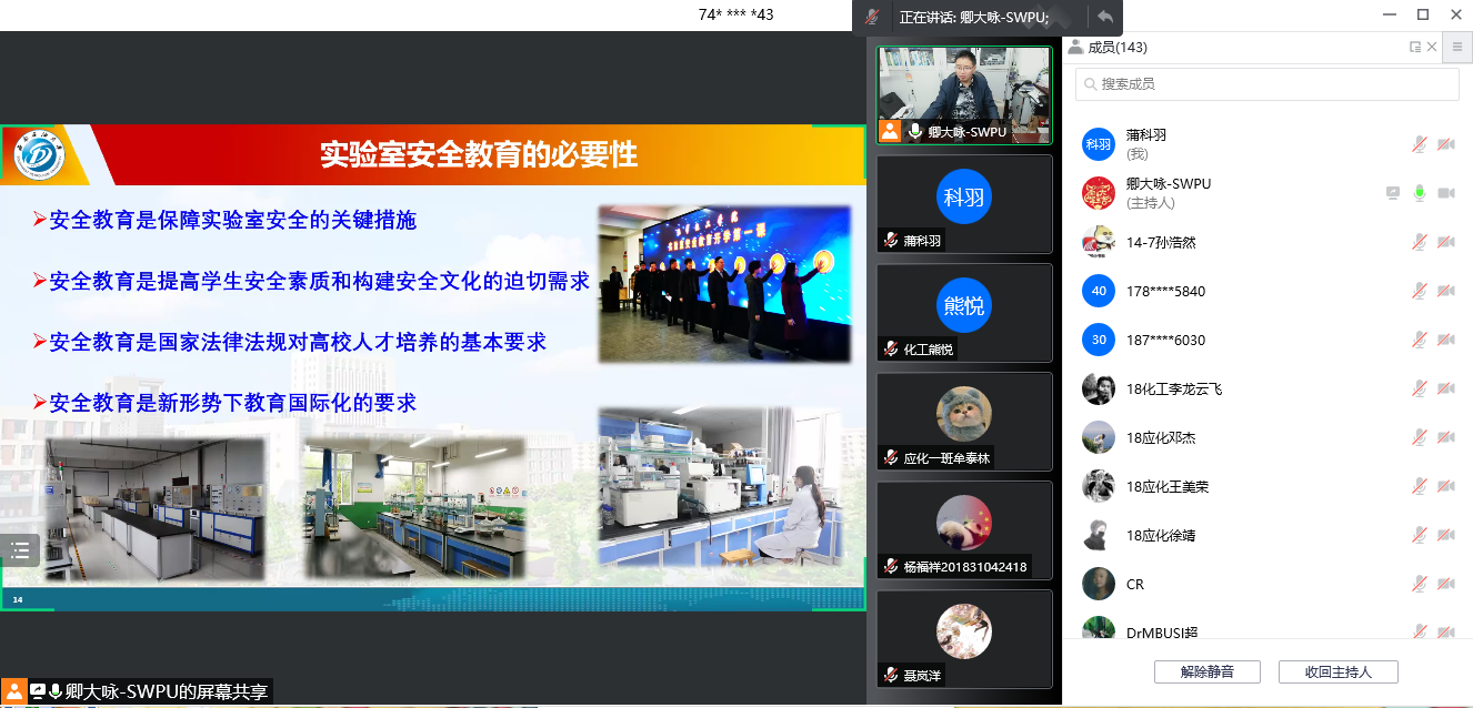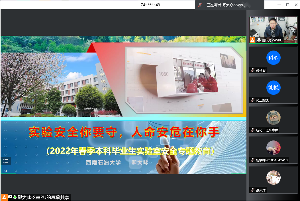 3月22日晚,化工院实验中心在线上对本学期在实验室完成本科毕业设计的2018级本科生进行了实验室安全专题教育,实验室分管安全工作副主任卿大咏、安全管理员赵徊洁和蒲科羽一同参加了此次讲座。