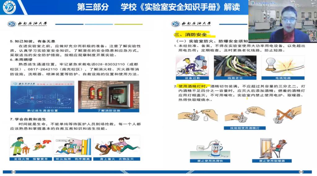 10月30日下午和晚上,化学化工学院组织两场专题讲座对化学化工学院所有本科生、硕博士研究生分别进行实验室安全准入教育和实验室基本风险识别与个体防护知识讲座。讲座由实验中心副主任卿大咏主讲,利用腾讯会议让全体学生在线进行了学习。