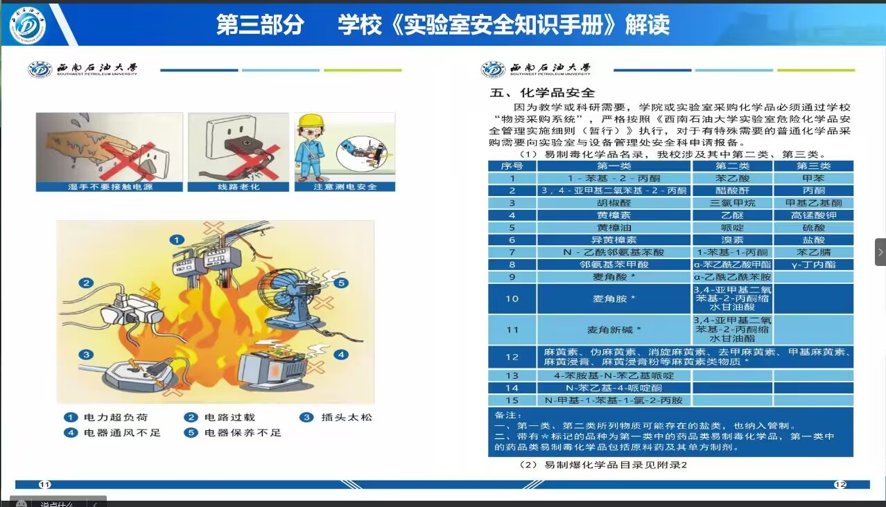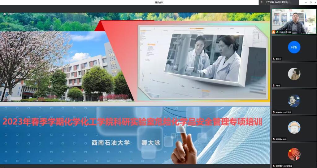 2023年3月29日下午,化工院实验中心开展了线上“2023年春季学期化学化工学院科研实验室危险化学品安全管理”专项培训,实验室分管安全工作副主任卿大咏对各科研实验室进行危化品专项培训,安全管理员赵徊洁和蒲科羽也参加了本次培训。