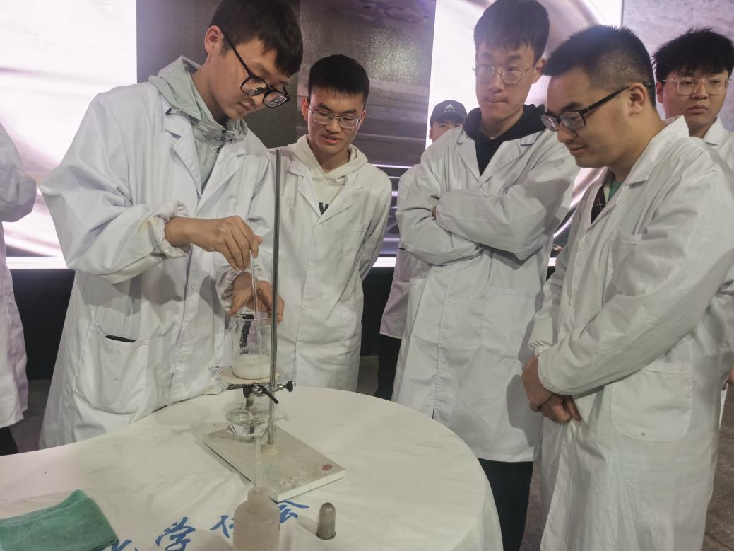 演示结束后,化学协会也邀请感兴趣的同学进行实验的操作,同时有专人负责实验过程的安全。参与实验的每组同学都获得了化学协会准备的零食盲盒的抽奖机会。在大家的努力下,互动实验也获得了成果。